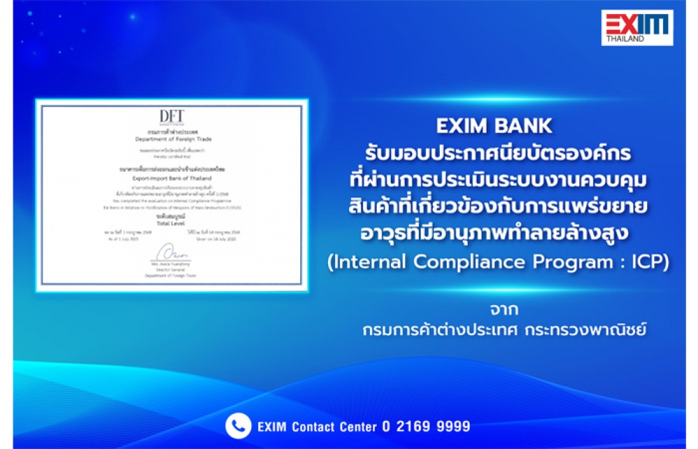 นิวส์ คอนเน็คท์ - ธนาคารเพื่อการส่งออกและนำเข้าแห่งประเทศไทย (EXIM BANK) รับมอบประกาศนียบัตรองค์กรที่ผ่านการประเมินระบบงานควบคุมสินค้าที่เกี่ยวข้องกับการแพร่ขยายอาวุธที่มีอานุภาพทำลายล้างสูง (Internal Compliance Program : ICP) จากกรมการค้าต่างประเทศ กระทรวงพาณิชย์ โดย EXIM BANK เป็นสถาบันการเงินแห่งเดียวที่ได้รับการรับรองระบบงาน ICP ตั้งแต่ปี 2566 เพื่อยกระดับมาตรฐานการควบคุมและป้องกันการนำเข้าและส่งออกสินค้าที่ใช้ได้สองทาง (Dual Use Item : DUI) ไม่ให้เกี่ยวข้องกับการแพร่ขยายอาวุธที่มีอานุภาพทำลายล้างสูง เสริมสร้างความเชื่อมั่นของนานาชาติต่อภาครัฐและภาคเอกชนของไทย