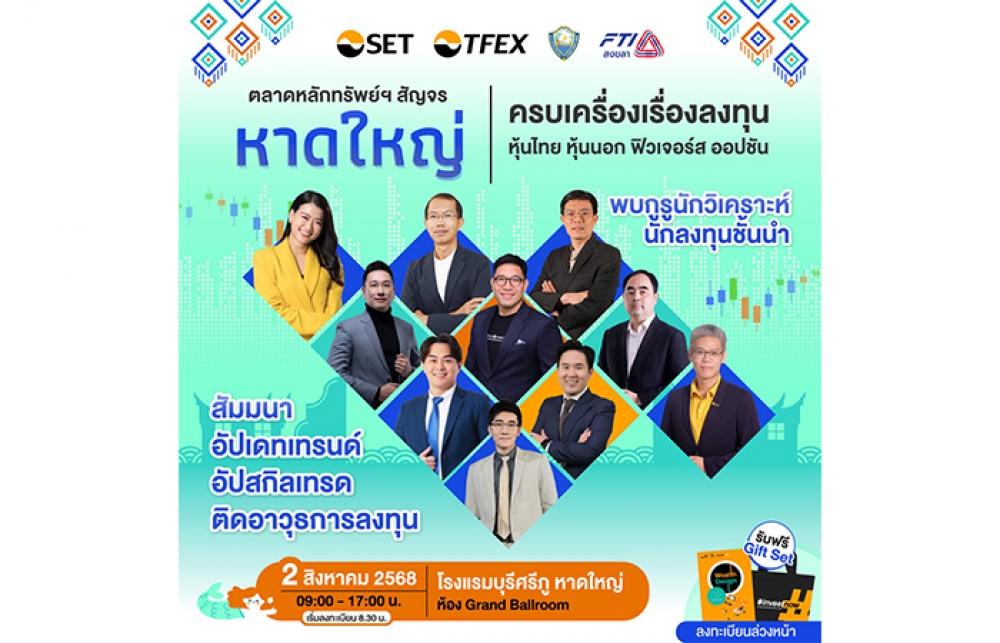 ตลาดหลักทรัพย์แห่งประเทศไทย เดินสายจัด “ตลาดหลักทรัพย์ฯ สัญจร หาดใหญ่” ยกทัพนักวิเคราะห์ นักลงทุน กูรูผู้เชี่ยวชาญให้ข้อมูล อัปเดตสถานการณ์ แลกเปลี่ยนมุมมอง พร้อมแนะแนวทางลงทุนครบวงจร ทั้งหุ้นไทย หุ้นนอก ฟิวเจอร์ส ออปชัน เหมาะทั้งกับมือใหม่และมือโปร ด้วยเนื้อหาจัดเต็มตลอดวันกับสัมมนาถึง 4 หัวข้อ ได้แก่ “ลงทุนต้องรู้.. เปิดเคล็ด(ไม่)ลับ ฉบับมือใหม่” “สแกนตลาด จัดพอร์ตหุ้นไทย vs หุ้นนอก” “เจาะกลยุทธ์ VI ทำกำไรช่วงวิกฤติ” และ “ลงทุนให้รอด เสริมพอร์ตด้วยฟิวเจอร์ส vs ออปชัน” พร้อมอัปสกิลเทรด เรียนรู้ทางเลือก เครื่องมือยุคใหม่ หาไอเดียเทรดวางแผนการลงทุน รับคำปรึกษาจากกลุ่มตลาดหลักทรัพย์ฯ พร้อมเปิดพอร์ตกับโบรกเกอร์ชั้นนำ เข้าร่วมสัมมนาฟรี! มีโปรโมชันมากมายภายในงาน ชวนเพื่อนพี่น้องชาวใต้ แล้วมาเจอกัน!
