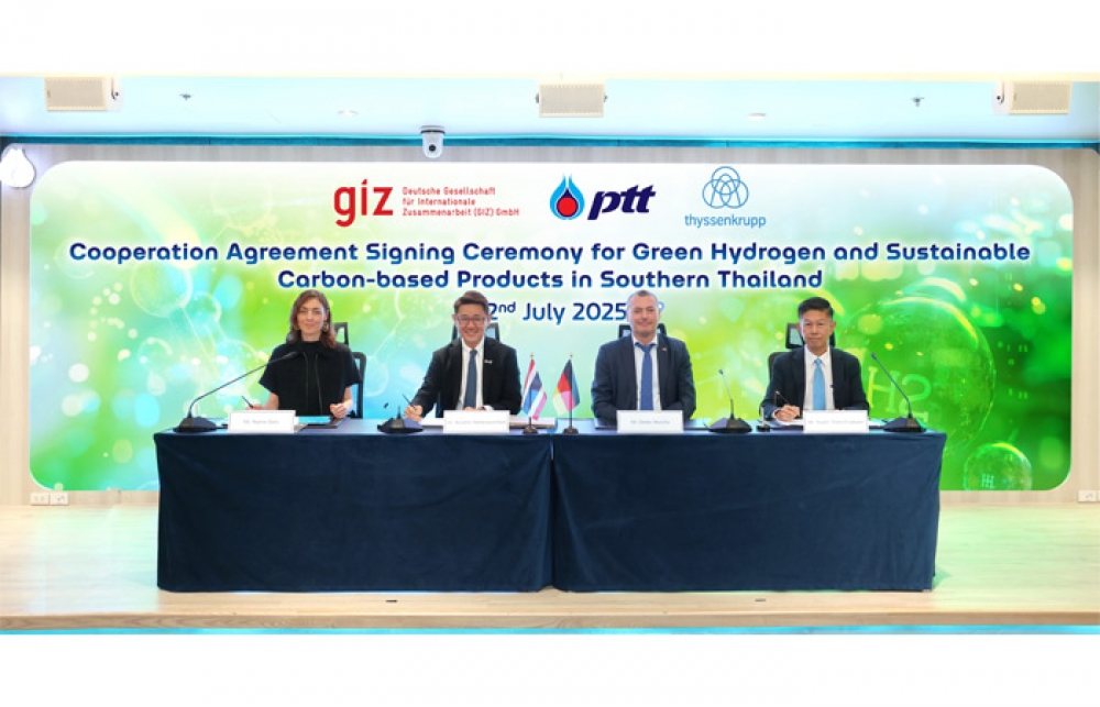 นิวส์ คอนเน็คท์ - บริษัท ปตท. จำกัด (มหาชน) ร่วมกับ บริษัท ธิสเซ่นครุปป์ อูเด้ห์ (ประเทศไทย) จำกัด และองค์กรความร่วมมือระหว่างประเทศของเยอรมัน (GIZ) ลงนามสัญญาความร่วมมือโครงการศึกษาโอกาสความเป็นไปได้ในการพัฒนาไฮโดรเจนสีเขียวและผลิตภัณฑ์คาร์บอนที่ยั่งยืน ในพื้นที่ภาคใต้ของประเทศไทย ภายใต้กรอบของโครงการ “H2Uppp” ซึ่งได้รับการสนับสนุนทางการเงิน จากกระทรวงเศรษฐกิจและพลังงานแห่งสหพันธรัฐเยอรมนี โดยได้รับเกียรติจาก Mr. Dieter Wurche ผู้แทนจากสถานเอกอัครราชทูตเยอรมนีประจำประเทศไทย เข้าร่วมในพิธีลงนาม โดยมี ดร.บุรณิน รัตนสมบัติ ประธานเจ้าหน้าที่ปฏิบัติการกลุ่มธุรกิจใหม่และความยั่งยืน ปตท. พร้อมด้วย นายยศศิริ พร้อมเชื้อแก้ว ประธานเจ้าหน้าที่บริหาร บริษัท ธิสเซ่นครุปป์ อูเด้ห์ (ประเทศไทย) จำกัด และ Ms. Regine Dietz ผู้อำนวยการกลุ่มโครงการไฮโดรเจน GIZ ร่วมลงนาม เพื่อศึกษาความเป็นไปได้ของการผลิตไฮโดรเจนสีเขียว รวมถึงผลิตภัณฑ์คาร์บอนที่ยั่งยืน อาทิ อี-เมทานอล และ อี-มีเทน โดยใช้พลังงานหมุนเวียนในพื้นที่ภาคใต้ของประเทศไทย โดยครอบคลุมการศึกษาเทคโนโลยีที่เหมาะสม การประเมินทรัพยากรในพื้นที่ และการวิเคราะห์ศักยภาพของตลาด ตลอดจนการจัดทำแผนแม่บท เพื่อพัฒนาโครงการในเชิงพาณิชย์ในอนาคต สอดรับกับพันธกิจของ ปตท. ในการขับเคลื่อนเศรษฐกิจและสังคมไทยให้เติบโตอย่างมั่นคงและยั่งยืน