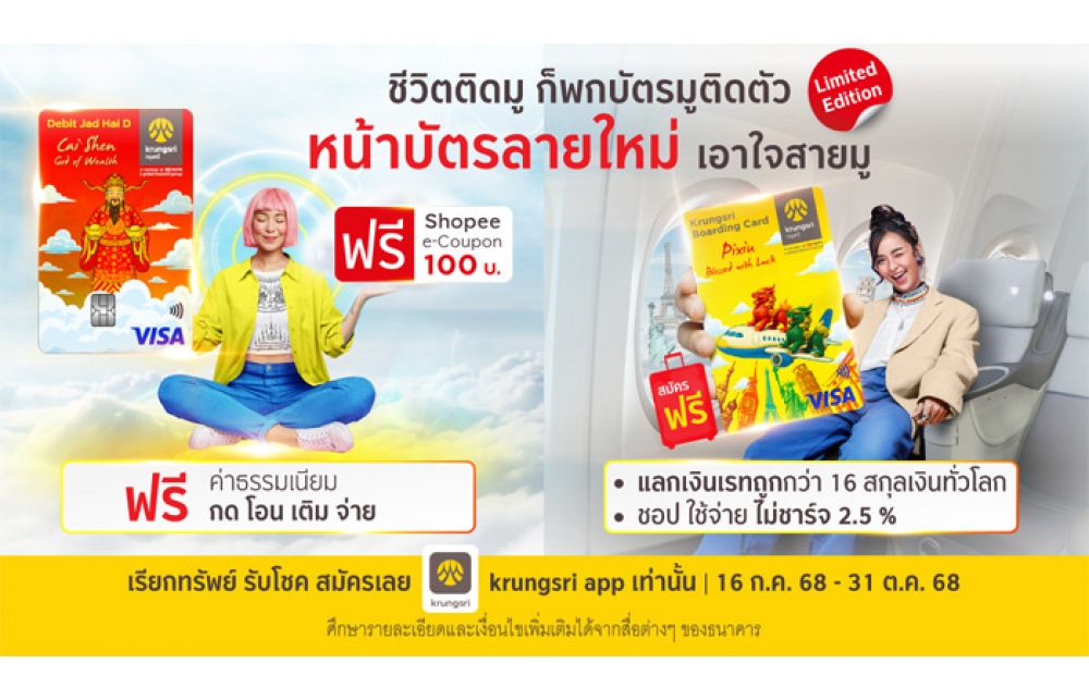 นิวส์ คอนเน็คท์ - ธนาคารกรุงศรีอยุธยา จำกัด (มหาชน)) เอาใจลูกค้าสายมูเตรู เปิดตัว 2 หน้าบัตรลายใหม่ “บัตรลายเทพเจ้าไฉ่ซิงเอี้ย” สำหรับผู้สมัครบัตรกรุงศรี เดบิต จัดให้ D ผ่าน krungsri app และ “บัตรลายปี่เซียะ” สำหรับผู้สมัครบัตร Krungsri Boarding Card ผ่าน krungsri app ด้วยความหมายมงคลที่ช่วยเสริมพลังบวก หนุนนำความสำเร็จให้กับลูกค้าผู้ถือบัตร ซึ่งทั้งสองหน้าบัตรเป็น Limited edition มีจำนวนจำกัด พร้อมรับสิทธิพิเศษเมื่อสมัครผ่าน krungsri app ตั้งแต่วันที่ 16 ก.ค. – 31 ต.ค. 2568 ผู้สนใจสามารถดูรายละเอียดและเงื่อนไขเพิ่มเติมได้ที่ บัตรกรุงศรี เดบิต จัดให้ D ลายเทพเจ้าไฉ่ซิงเอี้ย: