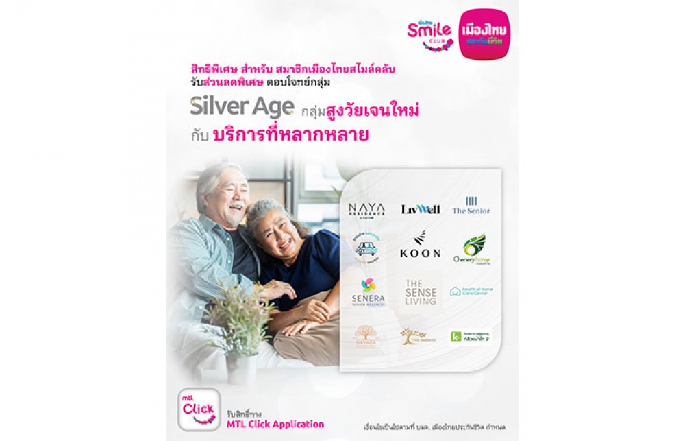 เมืองไทยประกันชีวิตโดย "เมืองไทยสไมล์คลับ" ผนึกกำลังพันธมิตรชั้นนำของประเทศ ตอบโจทย์กลุ่ม Silver Age ด้วยสิทธิพิเศษและบริการที่หลากหลาย ครอบคลุมทั้ง โครงการที่อยู่อาศัยแนวคิดใหม่เพื่อผู้สูงวัย ที่ยังกระฉับกระเฉง แต่ต้องการสภาพแวดล้อมที่เอื้อต่อการใช้ชีวิตอย่างมีคุณภาพและสะดวกสบาย (Independent Living), ที่อยู่อาศัยสำหรับผู้สูงวัย และผู้ป่วยที่ต้องการการดูแลอย่างใกล้ชิดตลอด 24 ชั่วโมง โดยทีมพยาบาลและผู้ดูแลมืออาชีพ พร้อมสิ่งอำนวยความสะดวกและการดูแลด้านสุขภาพอย่างครบครัน (Nursing Home), บริการรถรับ-ส่งพร้อมผู้ดูแล สำหรับผู้สูงวัย ผู้ป่วย และผู้ที่ต้องการความช่วยเหลือ ไปพบแพทย์ เดินทางสะดวก ปลอดภัย อุ่นใจทุกเส้นทางด้วยทีมดูแลมืออาชีพ, โรงพยาบาลดูแลผู้ป่วยระยะท้าย เน้นการบรรเทาอาการเจ็บป่วยให้สบายใจ ใกล้ชิดครอบครัว (Palliative Care Hospital)