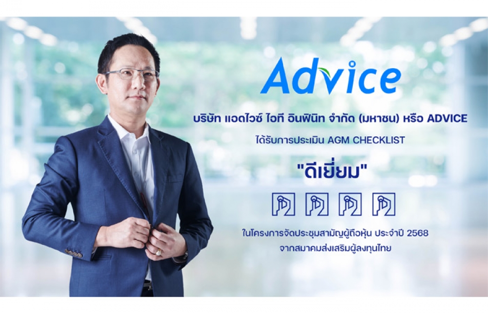 นิวส์ คอนเน็คท์ - บริษัท แอดไวซ์ ไอที อินฟินิท จำกัด (มหาชน) หรือ ADVICE ได้รับการประเมินคุณภาพการจัดประชุมสามัญผู้ถือหุ้นประจำปี 2568 (AGM Checklist) ในระดับสูงสุด “ดีเยี่ยม” เป็นปีแรก สะท้อนถึงความมุ่งมั่นในการดำเนินงานอย่างโปร่งใส มีธรรมาภิบาล และให้ความสำคัญกับสิทธิของผู้ถือหุ้นอย่างแท้จริง โดยการได้รับคะแนนระดับ “ดีเยี่ยม” ในปีแรกของการเข้าร่วมประเมิน สะท้อนถึงความมุ่งมั่นของ ADVICE ในการยึดหลักธรรมาภิบาล (Good Governance) อย่างเคร่งครัด แสดงถึงการกำกับดูแลกิจการที่ดี โปร่งใส และเป็นธรรม พร้อมตอกย้ำความพร้อมของบริษัทในการเติบโตอย่างยั่งยืนบนรากฐานที่มั่นคงและได้มาตรฐานสากล