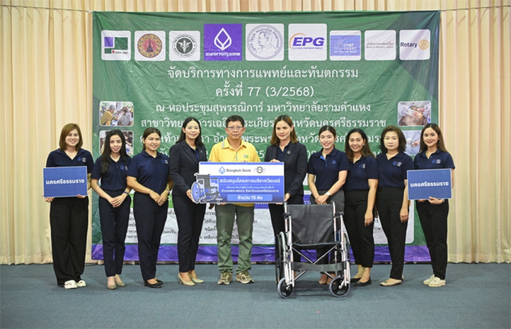 นิวส์ คอนเน็คท์ - ธนาคารกรุงเทพ จำกัด (มหาชน) นำโดย นางสาวชลมาศ ทองชัย ผู้จัดการสาขานครศรีธรรมราช พร้อมผู้จัดการสาขา และพนักงานในภาคใต้ 1 สายลูกค้าบุคคล ลงพื้นที่เป็นอาสาสมัคร ร่วมกับทีมแพทย์ เภสัชกร พยาบาล มอบเงินสนับสนุนจำนวน 100,000 บาท รถเข็นวีลแชร์ จำนวน 15 คัน แว่นสายตายาว จำนวน 800 อัน เพื่อสนับสนุนการจัดกิจกรรมออกหน่วยแพทย์ และทันตแพทย์เคลื่อนที่ ครั้งที่ 77 (ครั้งที่ 3 ของปี 2568) ของมูลนิธิหน่วยแพทย์ และทันตแพทย์เคลื่อนที่ (มพท.) โดยมี ทันตแพทย์ริม เกษสาคร ประธานมูลนิธิหน่วยแพทย์ และทันตแพทย์เคลื่อนที่ เป็นผู้รับมอบ ณ หอประชุมสุพรรณิการ์ มหาวิทยาลัยรามคำแหง สาขาวิทยบริการเฉลิมพระเกียรติ จังหวัดนครศรีธรรมราช เพื่อส่งเสริมผู้ป่วย ประชาชน ที่ด้อยโอกาสในพื้นที่ชนบท และถิ่นทุรกันดาร ได้รับบริการทางการแพทย์ และทันตกรรม ครอบคลุมการตรวจรักษาโรคทางอายุรกรรม โรคผิวหนัง โรคหู คอ จมูก โรคตา โรคเด็ก นวดกดจุด ฝังเข็ม รวมถึงให้บริการทางทันตกรรม อาทิ บริการใส่ฟันเทียมถอดได้แบบทั้งปาก และแบบบางส่วนชนิดฐานอะคริลิก ถอนฟัน ขูดฟัน รักษาโรคเหงือก อุดฟัน เคลือบหลุมร่องฟัน และเคลือบฟลูออไรด์ ซึ่งมีประชาชนเข้ารับบริการรวม 1,486 ราย โดยไม่เสียค่าใช้จ่ายใดๆ โอกาสนี้ นายสมชาย ลีหล้าน้อย ผู้ว่าราชการจังหวัดนครศรีธรรมราช ให้เกียรติเป็นประธานในพิธีเปิดกิจกรรมฯ