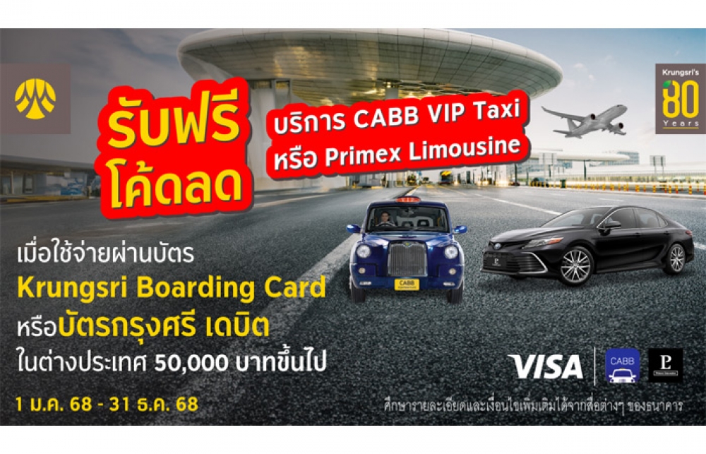 นิวส์ คอนเน็คท์ - ธนาคารกรุงศรีอยุธยา จำกัด (มหาชน)) มอบสิทธิพิเศษสำหรับผู้ถือบัตร Krungsri Boarding Card และกรุงศรี เดบิต ทุกประเภท รับฟรี ส่วนลดจากบริการ CABB VIP Taxi หรือ Primex Limousine เมื่อใช้จ่ายผ่านบัตร Krungsri Boarding Card หรือบัตรกรุงศรี เดบิต ทุกประเภท ที่เป็นรายการชำระเงิน ณ ร้านค้าใดก็ได้ในต่างประเทศ (ไม่รวมการใช้จ่ายผ่านร้านค้าออนไลน์) ภายใต้บัตรหมายเลขเดียวกัน ณ วันที่ทำรายการแลกรับสิทธิ์ ตั้งแต่วันที่ 1 มกราคม 2568 – 31 ธันวาคม 2568 ผู้ที่สนใจสามารถดูรายละเอียดและเงื่อนไขเพิ่มเติมได้ที่