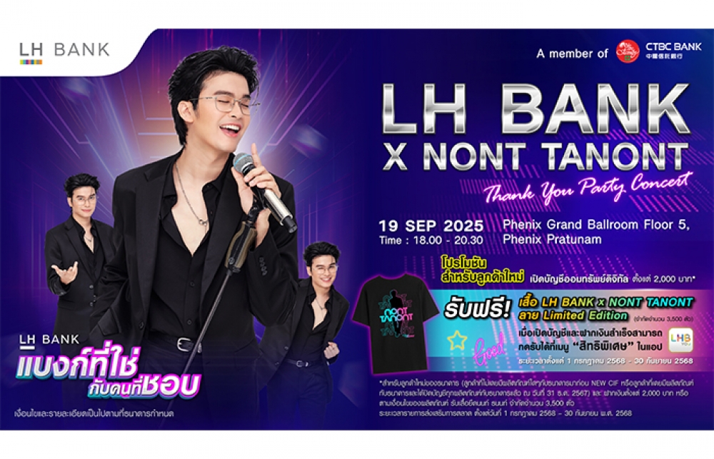 พิเศษ! เพื่อแทนคำขอบคุณ LH Bank ขอส่งมอบความสุขกับคอนเสิร์ต “LH BANK x NONT TANONT Thank You Party Concert” จำนวน 1,000 ที่นั่ง ในวันที่ 19 กันยายน 2568 เวลา 18.00-20.30 น. ณ Phenix Grand Ballroom ชั้น 5 ศูนย์การค้า Phenix ประตูน้ำ โดยลูกค้าปัจจุบันและลูกค้าใหม่ สามารถร่วมกิจกรรมรับบัตรคอนเสิร์ตได้ ณ บูธกิจกรรม LH Bank แบงก์ที่ใช่กับคนที่ชอบ ระหว่างวันที่ 20 – 21 และ 27 - 31 สิงหาคม 2568 ตามสถานที่ วันและเวลา ดังนี้