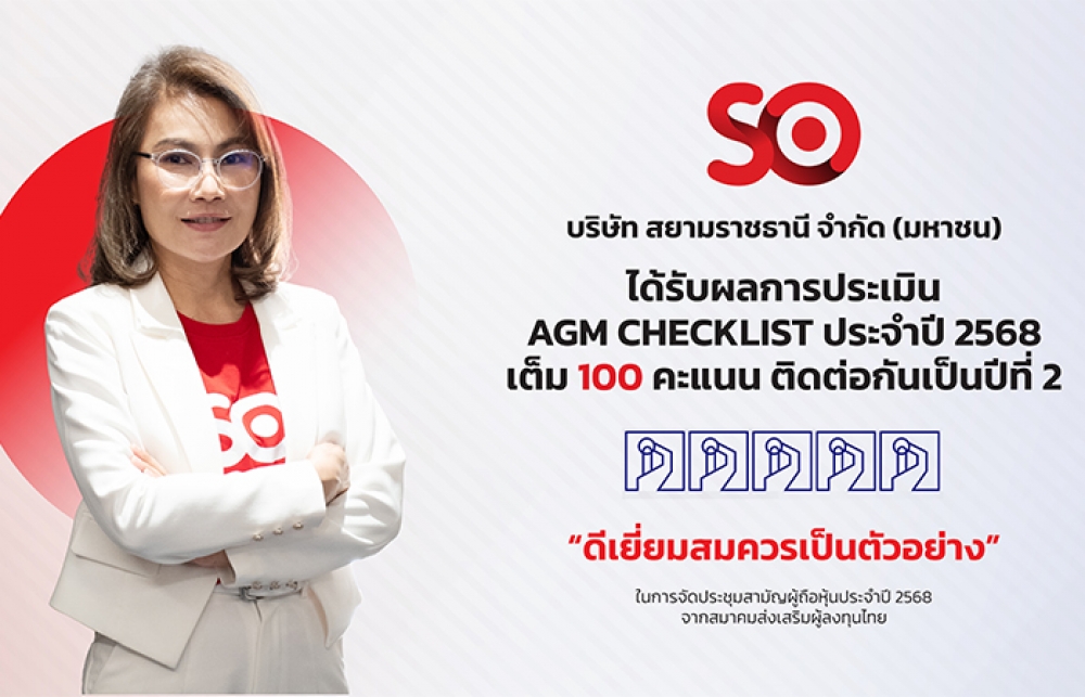 นิวส์ คอนเน็คท์ - SO ทำสถิติต่อเนื่องได้รับการประเมินจากโครงการประเมินคุณภาพการจัดประชุมสามัญผู้ถือหุ้น (AGM Checklist) ประจำปี 2568 ได้รับคะแนนสูงสุด 100 คะแนนเต็ม หรือ “ดีเยี่ยม สมควรเป็นตัวอย่าง” จากสมาคมส่งเสริมผู้ลงทุนไทย (Thai Investors Association) และสภาธุรกิจตลาดทุนไทย ต่อเนื่องเป็นปีที่ 2 (ประจำปี 2567– 2568)