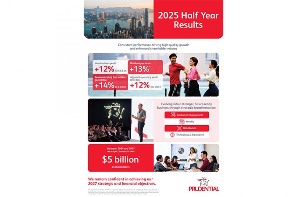 เมื่อวันที่ 27 สิงหาคม 2568 กลุ่มบริษัทพรูเด็นเชียล แถลงผลการดำเนินงานครึ่งปีแรก (สิ้นสุดวันที่ 30 มิ.ย. 68) รวมทั้งนำเสนอความคืบหน้าของแผนส่งมอบคุณค่าแก่ผู้ถือหุ้นอย่างต่อเนื่อง ภายใต้โครงการซื้อหุ้นคืนของบริษัทฯ สำหรับผลการดำเนินงานที่โดดเด่นในช่วงครึ่งปีแรกนั้น พรูเด็นเชียล มีผลกำไรธุรกิจใหม่ (New Business Profit) เติบโตเพิ่มขึ้น 12% เมื่อเทียบกับปีที่แล้ว อยู่ที่ 1,260 ล้านดอลลาร์สหรัฐ (ตามวิธีการคำนวณแบบ Traditional Embedded Value -TEV) บริษัทฯ มีกระแสเงินสดส่วนเกินจากธุรกิจประกันชีวิตที่ยังมีผลบังคับ และธุรกิจการจัดการสินทรัพย์ เพิ่มขึ้น 14% คิดเป็นมูลค่า 1,560 ล้านดอลลาร์สหรัฐ