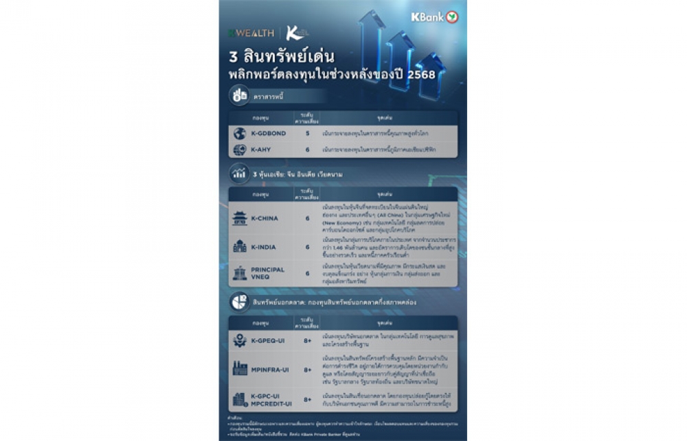 นอกเหนือจาก 3 สินทรัพย์เด่น กลยุทธ์การลงทุนหลักสำคัญสำหรับครึ่งหลังปี 2568 คือ วางแกนหลัก (Core Portfoilo) ให้มั่นคง แล้วเสริมโอกาส (Satellite Portfolio) ตามความเสี่ยงที่นักลงทุนรับได้ โดย KBank Private Banking ยังแนะนำให้พอร์ตการลงทุนหลักมีน้ำหนัก 50% ขึ้นไป โดยแนะนำให้ลงทุนใน “กองทุนผสมหลายสินทรัพย์ทั่วโลก” ที่มีผู้จัดการมืออาชีพคอยปรับพอร์ต เพื่อให้ความเสี่ยงกับโอกาสสมดุล โดยแนะนำให้ลงทุนในกองทุนอย่าง K-ALLROADS Series หรือ K-WEALTH PLUS Series