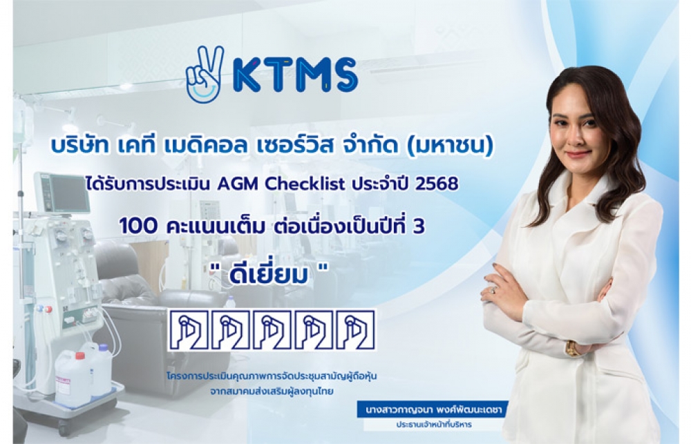 นิวส์ คอนเน็คท์ - นางสาวกาญจนา พงศ์พัฒนะเดชา ประธานเจ้าหน้าที่บริหาร บริษัท เคที เมดิคอล เซอร์วิส จำกัด (มหาชน) หรือ KTMS เปิดเผยว่า บริษัทเดินหน้าตอกย้ำความมุ่งมั่นในการบริหารองค์กรสู่ความสำเร็จ ภายใต้การเปิดเผยข้อมูลอย่างครบถ้วน โปร่งใส และการปฏิบัติตามหลักบรรษัทภิบาล (Corporate Governance) อย่างเคร่งครัด โดยล่าสุด ได้รับคะแนนการประเมินคุณภาพการจัดประชุมสามัญผู้ถือหุ้น (AGM Checklist) ประจำปี 2568 ในระดับ “ดีเยี่ยม” ด้วยคะแนนเต็ม 100 คะแนน ต่อเนื่องเป็นปีที่ 3 จากสมาคมส่งเสริมผู้ลงทุนไทย (Thai Investors Association) ร่วมกับ สมาคมบริษัทจดทะเบียน ซึ่งสะท้อนถึงความสำเร็จและความแข็งแกร่งของบริษัทในการดำเนินธุรกิจอย่างมีจริยธรรม โปร่งใส อีกทั้งสร้างความเชื่อมั่นแก่ผู้ถือหุ้น และนักลงทุนอย่างต่อเนื่อง พร้อมขับเคลื่อนยกระดับการพัฒนาประสิทธิภาพการประชุมเพื่อเสริมความเชื่อมั่นและคุณค่าแก่ผู้มีส่วนได้เสียทุกฝ่าย ซึ่งถือเป็นรากฐานสำคัญในการสร้างความเชื่อมั่นต่อผู้ถือหุ้นและนักลงทุน สู่การเติบโตของธุรกิจอย่างยั่งยืน