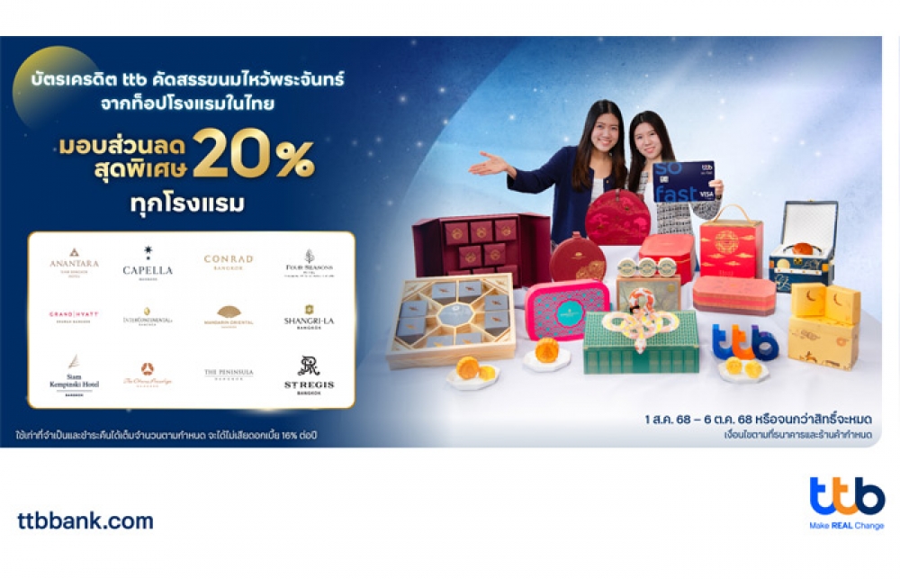 นิวส์ คอนเน็คท์ – ธนาคารทหารไทยธนชาต หรือ ทีทีบี ร่วมฉลองเทศกาลไหว้พระจันทร์ส่งมอบความสุข ความอร่อย โดยคัดสรรขนมไหว้พระจันทร์สุดพรีเมียม จาก 12 โรงแรมชั้นนำของประเทศไทย พร้อมรับส่วนลด 20% เฉพาะผู้ถือบัตรเครดิต ttb บัตรเครดิต ttb Global House และบัตรเครดิต ttb Disney แบบไม่มีขั้นต่ำ จาก 12 โรงแรมชั้นนำในประเทศไทย ได้แก่ Mandarin Oriental Bangkok, Grand Hyatt Erawan Bangkok, InterContinental Bangkok, Shangri-La Bangkok, The Peninsula Bangkok, Anantara Siam Bangkok Hotel, Siam Kempinski Hotel Bangkok, The Okura Prestige Bangkok, Capella Bangkok, Conrad Bangkok, Four Seasons Hotel Bangkok at Chao Phraya River และ The St. Regis Bangkok ตั้งแต่วันที่ 1 สิงหาคม - 6 ตุลาคม 2568 ศึกษารายละเอียดเพิ่มเติมของโปรโมชัน ได้ที่