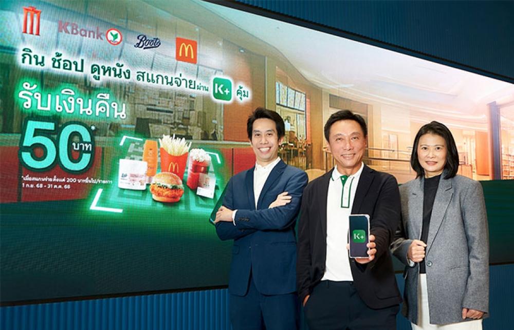 ดร.เกษชญง สกาวรัตนานนท์ รองผู้จัดการใหญ่ (กลาง) ธนาคารกสิกรไทย นายนรุตม์ เจียรสนอง (ซ้าย) รองประธานเจ้าหน้าที่บริหารฝ่ายการตลาด บมจ. เมเจอร์ ซีนีเพล็กซ์ กรุ้ป และนางสาวพรรณี ศานติวิวัฒน์กุล (ขวา) ผู้อำนวยการฝ่ายการตลาด บริษัท บู๊ทส์ รีเทล (ประเทศไทย) จำกัด ร่วมด้วย บริษัท แมคไทย จำกัด เปิดตัวโปรโมชันพิเศษให้ลูกค้า K PLUS ที่ซื้อสินค้าหรือใช้บริการที่ 3 ร้านค้าแบรนด์ดัง เพียงชมภาพยนตร์ทุกเรื่องทุกรอบที่ Major Cineplex ช้อปสินค้าสุขภาพและความงามที่ Boots หรืออิ่มอร่อยทุกเมนูที่ McDonald’s ทุกสาขาทั่วประเทศ แล้วสแกนจ่ายด้วย K PLUS ผ่านเครื่องรับชำระเงินธนาคารกสิกรไทย ตั้งแต่ 200 บาทขึ้นไปต่อรายการ รับเงินคืนคุ้ม 50 บาท (จำกัด 1 ท่านต่อ 1 สิทธิ์ต่อแบรนด์ต่อเดือน จำกัด 4,500 สิทธิ์ต่อแบรนด์ตลอดแคมเปญ รวมจำกัด 13,500 สิทธิ์ ตลอดระยะรายการส่งเสริมการขาย) ตั้งแต่ 1 กันยายน 2568 – 31 ตุลาคม 2568