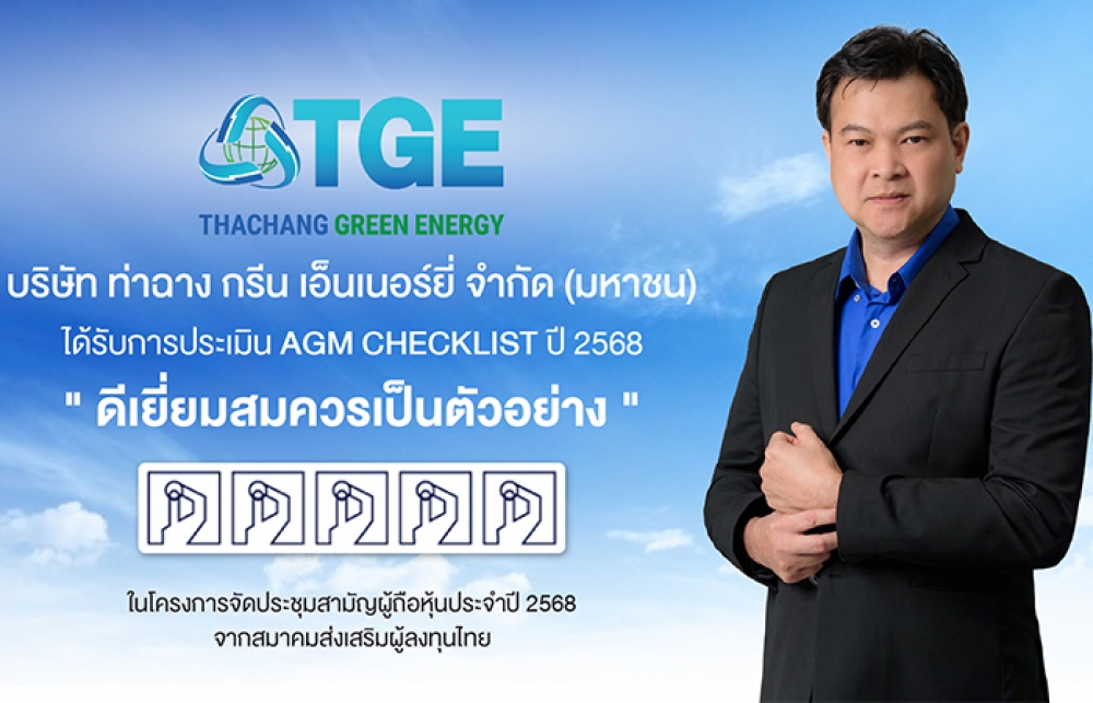 บริษัท ท่าฉาง กรีน เอ็นเนอร์ยี่ จำกัด (มหาชน) หรือ TGE ผู้ผลิตและจำหน่ายไฟฟ้าพลังงานทดแทน ประกาศความสำเร็จคว้า คะแนนเต็ม 100 คะแนน ระดับ “ดีเยี่ยมสมควรเป็นตัวอย่าง (Excellent)” ในการประเมิน AGM Checklist ปี 2568 จัดโดยสมาคมส่งเสริมผู้ลงทุนไทยและสภาธุรกิจตลาดทุนไทย ต่อเนื่องเป็นปีที่ 3 ผลการประเมินครั้งนี้สะท้อนถึง ความมุ่งมั่นของ TGE ในการดำเนินธุรกิจด้วยหลักบรรษัทภิบาล โปร่งใส และเคารพสิทธิผู้ถือหุ้น ควบคู่กับการพัฒนากระบวนการจัดประชุมผู้ถือหุ้นให้มีประสิทธิภาพตามมาตรฐานสากล