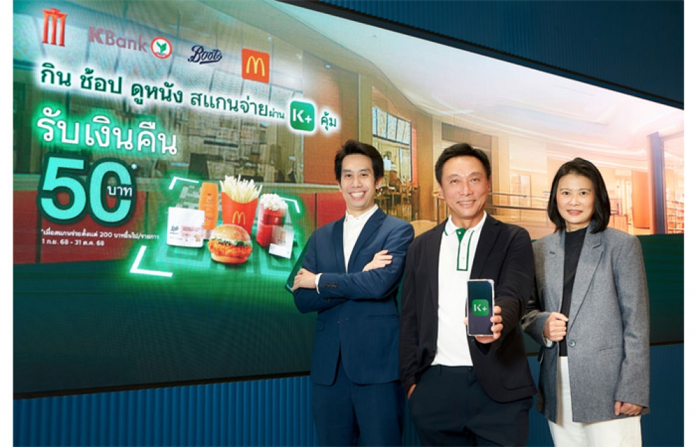 นิวส์ คอนเน็คท์ - ดร.เกษชญง สกาวรัตนานนท์ รองผู้จัดการใหญ่ (กลาง) ธนาคารกสิกรไทย นายนรุตม์ เจียรสนอง (ซ้าย) รองประธานเจ้าหน้าที่บริหารฝ่ายการตลาด บมจ. เมเจอร์ ซีนีเพล็กซ์ กรุ้ป และนางสาวพรรณี ศานติวิวัฒน์กุล (ขวา) ผู้อำนวยการฝ่ายการตลาด บริษัท บู๊ทส์ รีเทล (ประเทศไทย) จำกัด ร่วมด้วย บริษัท แมคไทย จำกัด เปิดตัวโปรโมชันพิเศษให้ลูกค้า K PLUS ที่ซื้อสินค้าหรือใช้บริการที่ 3 ร้านค้าแบรนด์ดัง เพียงชมภาพยนตร์ทุกเรื่องทุกรอบที่ Major Cineplex ช้อปสินค้าสุขภาพและความงามที่ Boots หรืออิ่มอร่อยทุกเมนูที่ McDonald’s ทุกสาขาทั่วประเทศ แล้วสแกนจ่ายด้วย K PLUS ผ่านเครื่องรับชำระเงินธนาคารกสิกรไทย ตั้งแต่ 200 บาทขึ้นไปต่อรายการ รับเงินคืนคุ้ม 50 บาท (จำกัด 1 ท่านต่อ 1 สิทธิ์ต่อแบรนด์ต่อเดือน จำกัด 4,500 สิทธิ์ต่อแบรนด์ตลอดแคมเปญ รวมจำกัด 13,500 สิทธิ์ ตลอดระยะรายการส่งเสริมการขาย) ตั้งแต่ 1 กันยายน 2568 – 31 ตุลาคม 2568