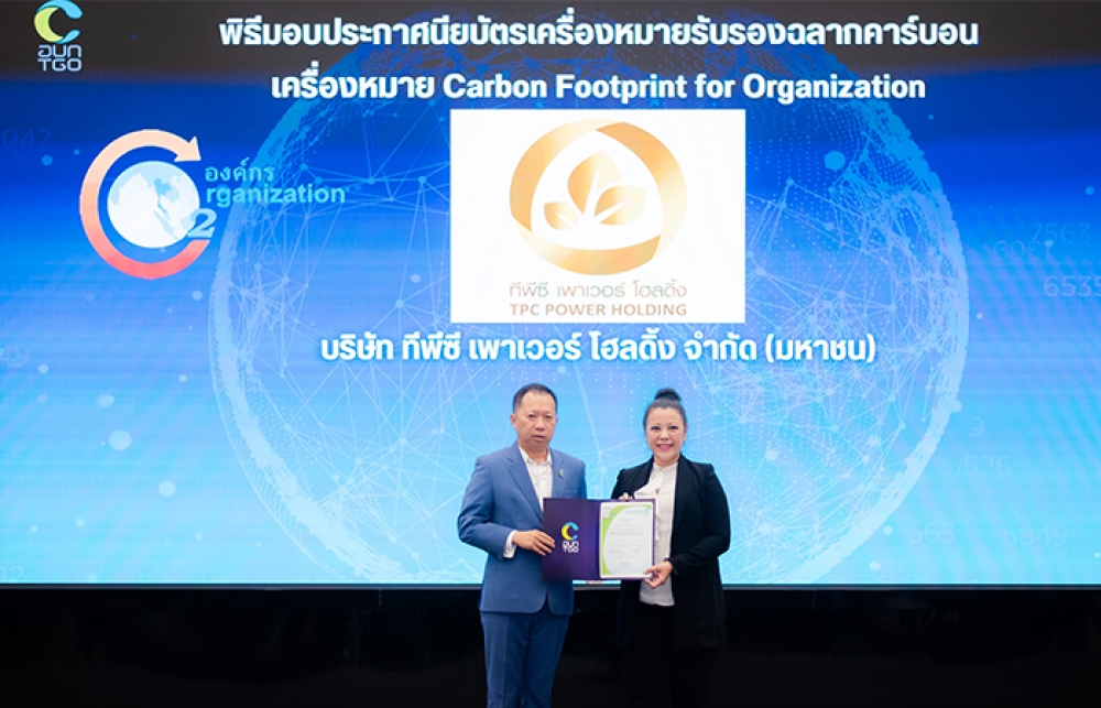 นางสาวนันท์นภัส สระบงกช (ขวา) ผู้ช่วยกรรมการผู้จัดการใหญ่ ฝ่ายบริหารจัดการองค์กรเพื่อความยั่งยืน บริษัท ทีพีซี เพาเวอร์ โฮลดิ้ง จำกัด (มหาชน) (TPCH) เข้ารับประกาศนียบัตรเครื่องหมายคาร์บอนฟุตพริ้นท์ขององค์กร (Carbon Footprint for Organization : CFO) จาก นายณกรณ์ ตรรกวิรพัท (ซ้าย) ผู้อำนวยการองค์การบริหารจัดการก๊าซเรือนกระจก (องค์การมหาชน) หรือ อบก. ภายในงาน “พิธีมอบประกาศนียบัตรเครื่องหมายรับรองฉลากคาร์บอน” จัดโดยองค์การบริหารจัดการก๊าซเรือนกระจก ทั้งนี้ TPCH ยังคงเป้าหมายการเป็นองค์กรที่มีความเป็นกลางทางคาร์บอน (Carbon Neutral) พร้อมทั้งเป็นองค์กรที่ปล่อยก๊าซเรือนกระจกสุทธิเป็นศูนย์ (Net Zero Pathway) ภายในปี 2575 อีกด้วย ซึ่งงานดังกล่าวจัดขึ้น ณ ห้อง Conference Hall สถาบันเพื่อการยุติธรรมแห่งประเทศไทย (TIJ) ถนนแจ้งวัฒนะ กรุงเทพฯ เมื่อเร็วๆ นี้