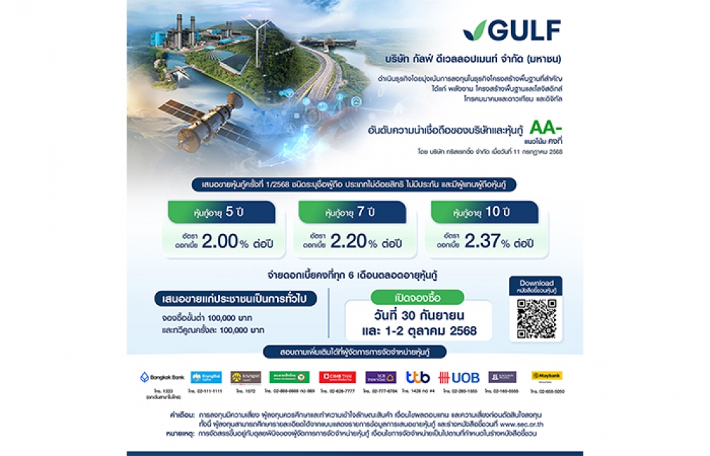 เมื่อวันที่ 19 กันยายน 2568 บริษัท กัลฟ์ ดีเวลลอปเมนท์ จำกัด (มหาชน) หรือ GULF ประกาศอัตราดอกเบี้ยหุ้นกู้ทั้ง 4 ชุด อายุหุ้นกู้ระหว่าง 3 -10 ปี โดยมีอัตราดอกเบี้ยคงที่ระหว่าง 1.76 – 2.37% ต่อปี พร้อมชี้ 5 เหตุผลที่ควรลงทุนกับ GULF 1) ธุรกิจมีความแข็งแกร่ง 2) ฐานะทางการเงินมีความมั่นคง 3) มีอันดับเครดิตสูงที่ “AA-” 4) ให้ผลตอบแทนมั่นคงและสม่ำเสมอ และ 5) เป็นเครื่องมือลงทุนที่เหมาะสมในภาวะเศรษฐกิจผันผวนและทิศทางดอกเบี้ยอยู่ในขาลง โดยหุ้นกู้ดังกล่าวพร้อมเสนอขายแก่ประชาชนทั่วไปและผู้ลงทุนสถาบัน ผ่านสถาบันการเงินชั้นนำ 10 แห่ง ระหว่างวันที่ 30 กันยายน และวันที่ 1-2 ตุลาคม 2568