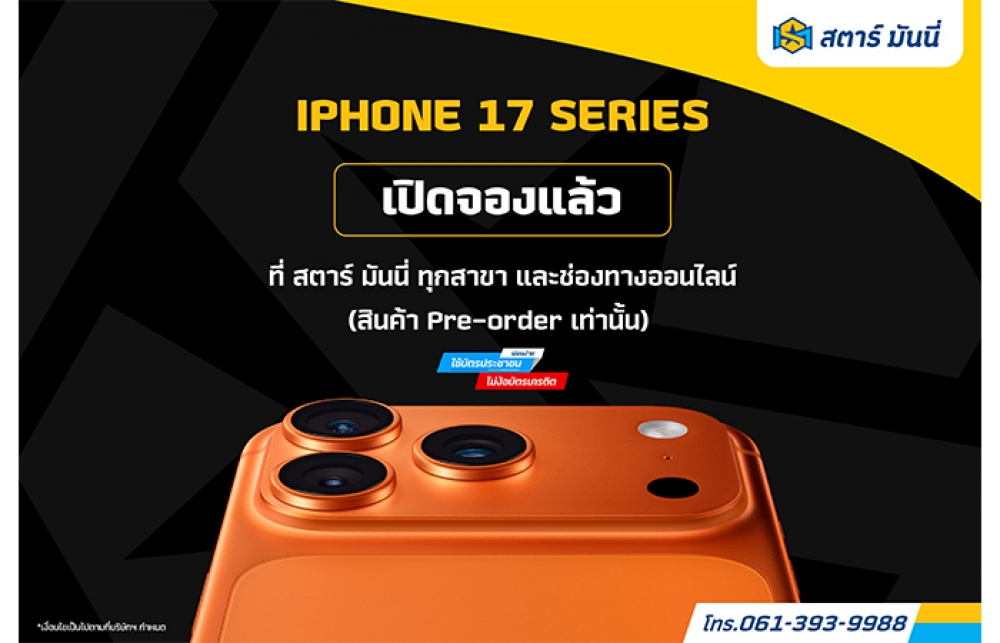 บมจ.สตาร์ มันนี่ (STARM) เร่งเครื่องรับดีมานด์ผู้บริโภค เปิดให้จอง iPhone 17 Series และ iPhone Air แล้ววันนี้!!! ผ่านทุกสาขาภาคตะวันออกและช่องทางออนไลน์ ชูจุดขาย “ง่ายสุดๆ ใช้แค่บัตรประชาชน” ไม่ต้องใช้บัตรเครดิต พร้อมโปรผ่อนสบายสูงสุด 24 เดือน* จับกลุ่มสายไอที–แฟชั่น ที่อยากอัปเกรดก่อนใคร...แวดวงนักลงทุนคาดกระแสแรงหนุนรายได้ครึ่งปีหลังพุ่ง!