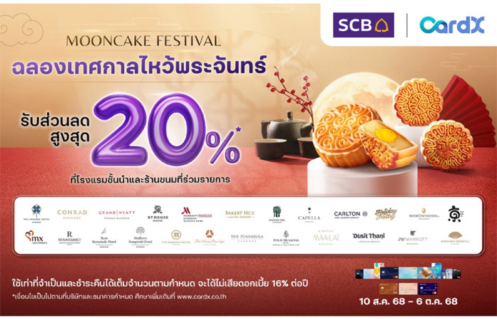 ทั้งนี้ สมาชิกบัตรเครดิต CardX จะได้รับความคุ้มค่าพร้อมความอร่อยในช่วงเทศกาล ด้วยส่วนลดพิเศษจากหลากหลายพันธมิตร อาทิ The Athenee Hotel รับส่วนลด 20%, Conrad Bangkok, Grand Hyatt Erawan Bangkok, The St. Regis Bangkok รับส่วนลด 15%, Bangkok Marriott Marquis Queen’s Park, Bakery Hut, Capella Bangkok, Banyan Tree Bangkok, Carlton Hotel Bangkok Sukhumvit, Holiday Pastry, InterContinental Bangkok, Renaissance Bangkok Ratchaprasong Hotel, Siam Kempinski Hotel Bangkok, รับส่วนลด 10% และร้านขนมชื่อดัง Kyo Roll En, MX Cakes & Bakery รับส่วนลด 10% ระยะเวลาโปรโมชันตั้งแต่วันนี้ – 6 ต.ค. 2568 สอบถามรายละเอียดเพิ่มเติมและตรวจสอบเงื่อนไขได้ที่
