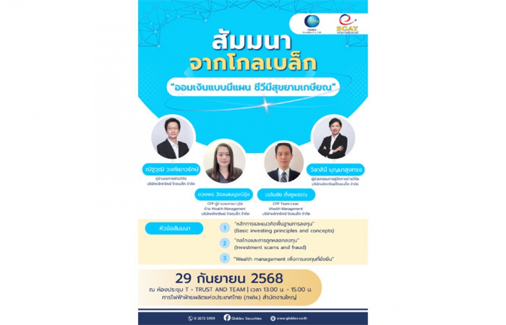 นิวส์ คอนเน็คท์ - บริษัทหลักทรัพย์ โกลเบล็ก จำกัด (GBS) ได้จัดสัมมนาขึ้นในหัวข้อ “ออมเงินแบบมีแผน ชีวีมีสุขยามเกษียณ” เพื่อส่งเสริมความรู้ด้านการเงินและการลงทุนให้แก่ประชาชน พร้อมเสริมทักษะการบริหารจัดการเงินอย่างมีประสิทธิภาพ ล่าสุด บล.โกลเบล็ก จัดกระบวนทัพนำทีมกูรู ด้านการลงทุน อาทิ วิลาสินี บุญมาสูงทรง ผู้ช่วยกรรมการผู้จัดการ, ณัฐวุฒิ วงศ์เยาวรักษ์ ผู้อำนวยการฝ่ายวิจัย, ดวงพร วัฒนสมบูรณ์รุ่ง ผู้อำนวยการอาวุโส ฝ่าย Wealth Management และ เฉลิมชัย ตั้งชูพรรณ Team Lead Wealth Management จะมาให้ความรู้กับทีมผู้บริหาร และ พนักงานการไฟฟ้าฝ่ายผลิตแห่งประเทศไทย (กฟผ.) ได้เข้าใจถึงการลงทุน และวิธีการออมที่ถูกต้องและมีแบบแผน รวมถึงการรับมือจากภัยการลงทุนต่อกรณีสถานการณ์ที่อาจเข้าข่ายถูกหลอกลวงลงทุนและมีภูมิคุ้มกันจากภัยกลโกงรูปแบบต่าง ๆ โดยงานดังกล่าวจะจัดขึ้น วันที่ 29 กันยายน 2568 เวลา13.00-15.00 น. ณ ห้องประชุม T-Trust and Team กฟผ.สำนักงานใหญ่