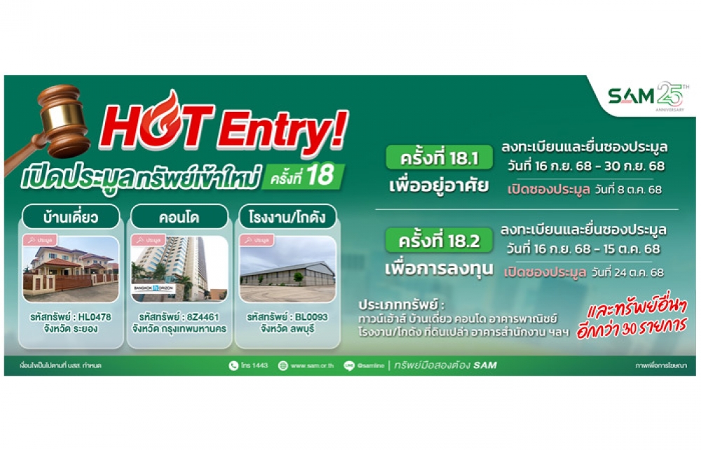 ทั้งนี้ ผู้สนใจเข้าร่วมประมูลสามารถลงทะเบียนและยื่นซองประมูล พร้อมเอกสารประกอบการประมูลที่กำหนด โดยทรัพย์เพื่อที่อยู่อาศัยและเพื่อการลงทุน ราคาไม่เกิน 20 ล้านบาท (ครั้งที่ 18.1/2568) ภายในวันที่ 30 ก.ย. 2568 และกำหนดเปิดซองประมูลวันที่ 8 ต.ค. 2568 ส่วนทรัพย์ที่มีราคาสูงกว่า 20 ล้านบาท (ครั้งที่ 18.2/2568) ภายในวันที่ 15 ต.ค. 2568 และกำหนดเปิดซองประมูลวันที่ 24 ต.ค. 2568 เวลา 10.00 น. เป็นต้นไป ที่สำนักงานใหญ่ SAM อาคารซันทาวเวอร์ส ถ.วิภาวดีรังสิต กรุงเทพฯ หรือสอบถามรายละเอียดเพิ่มเติมได้ที่ Call Center 1443 และดูรายละเอียดทรัพย์สินได้ทางเว็บไซต์ที่