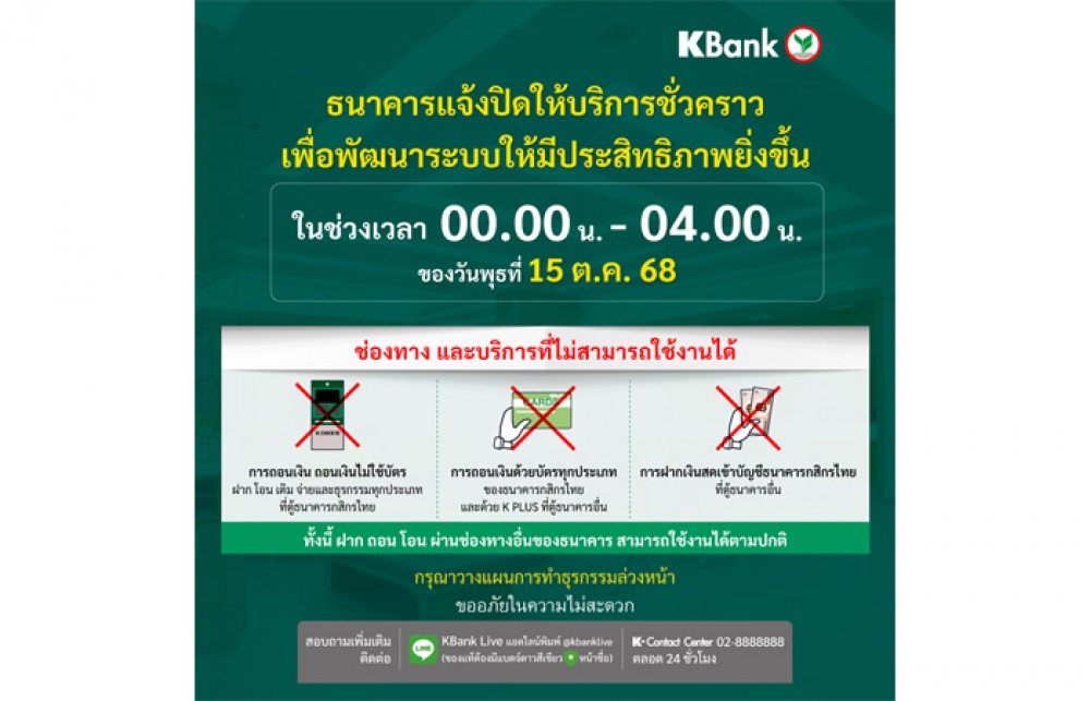 ทั้งนี้ ฝาก ถอน โอน ผ่านช่องทางอื่นของธนาคาร สามารถใช้งานได้ตามปกติ กรุณาวางแผนการทำธุรกรรมล่วงหน้า ธนาคารขออภัยในความไม่สะดวก สอบถามข้อมูลได้ที่ LINE KBank Live แอดไลน์พิมพ์ @kbanklive (ของแท้ต้องมีแบดจ์ดาวสีเขียวหน้าชื่อ) หรือ K-Contact Center โทร.02-8888888 ตลอด 24 ชั่วโมง