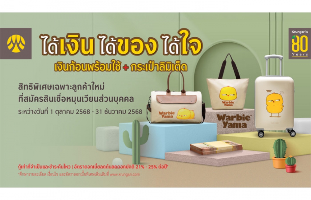 นิวส์ คอนเน็คท์ - ธนาคารกรุงศรีอยุธยา จำกัด (มหาชน) มอบสิทธิพิเศษสำหรับลูกค้าใหม่ที่สมัครสินเชื่อหมุนเวียนส่วนบุคคลระหว่างวันที่ 1 ตุลาคม – 31 ธันวาคม 2568 โดยได้รับอนุมัติสินเชื่อ และรับเงินกู้ด้วยวิธีโอนเงินเข้าบัญชีเงินฝากธนาคารกรุงศรีอยุธยา ภายในวันที่ 31 มกราคม 2569 จะได้รับของกำนัลตามวงเงินอนุมัติ ดังนี้ ตั้งแต่ 150,000 บาท – 499,999 บาท จะได้รับกระเป๋า Warbie Yama Tote Bag Limited Edition มูลค่า 1,950 บาท, ตั้งแต่ 500,000 – 999,999 บาท จะได้รับกระเป๋า Warbie Yama Sport Bag Limited Edition มูลค่า 2,750 บาท และตั้งแต่ 1,000,000 บาทขึ้นไป จะได้รับกระเป๋าเดินทางล้อลาก Warbie Yama Luggage Limited Edition มูลค่า 5,290 บาท ผู้สนใจสามารถดูรายละเอียดและเงื่อนไขเพิ่มเติมได้ที่