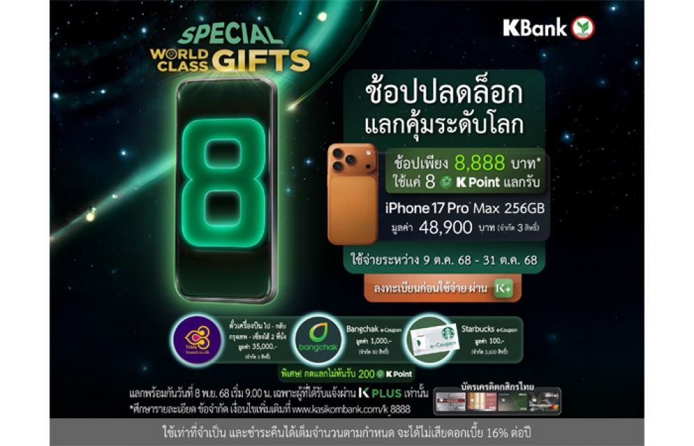 ทั้งนี้ หากพลาดในช่วงแคมเปญข้างต้น สามารถติดตามเซอร์ไพรส์ใหม่ของ Special WORLD CLASS GIFTS: ช้อปปลดล็อก แลกคุ้มระดับโลก กับบัตรเครดิตกสิกรไทยได้อีกครั้ง โดยลงทะเบียนก่อนใช้จ่ายผ่าน K PLUS และใช้จ่ายสะสมผ่านบัตรเครดิตกสิกรไทย ครบ 8,888 บาท ในหมวดสินค้าที่ร่วมรายการ ระหว่างวันที่ 1 - 30 พ.ย. 2568 และแลกรับสินค้าได้ในวันที่ 8 ธ.ค. 2568 เวลา 9.00 น. ศึกษารายละเอียด ข้อจำกัด เงื่อนไขเพิ่มเติมที่ www.kasikornbank.com/k_8888