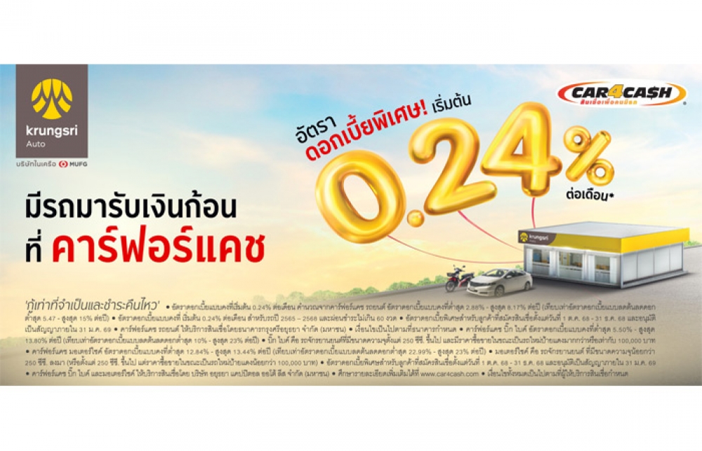 คาร์ฟอร์แคช หั่นดอกเบี้ยเริ่มต้น 0.24% ต่อเดือน เสริมสภาพคล่องคนมีรถ