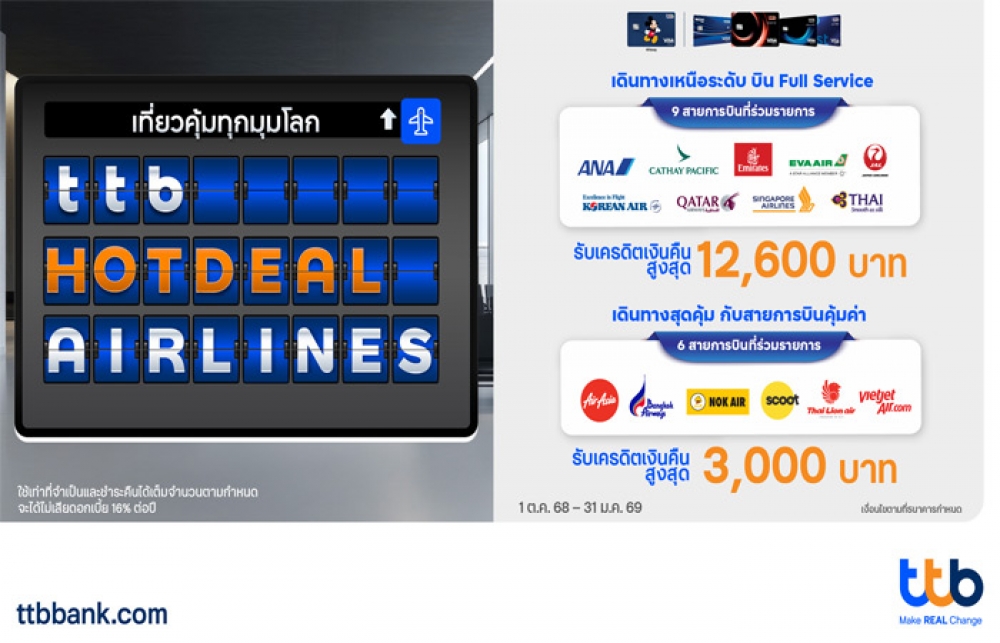 นิวส์ คอนเน็คท์ – ธนาคารทหารไทยธนชาต หรือ TTB ชวนเที่ยวคุ้มทุกมุมโลก มอบสิทธิพิเศษสำหรับผู้ถือบัตรเครดิต ttb บัตรเครดิต ttb Global House และบัตรเครดิต ttb Disney จ่ายคุ้มทุกการเดินทาง เมื่อชำระค่าบัตรโดยสารแบบเต็มจำนวนผ่านช่องทางเว็ปไซต์ หรือ โมบาย แอปพลิเคชัน หรือ เคาน์เตอร์จำหน่ายบัตรโดยสารของสายการบินโดยตรงเท่านั้น กับ 15 สายการบินที่ร่วมรายการ ตั้งแต่วันที่ 1 ต.ค. 2568 – 31 ม.ค. 2569