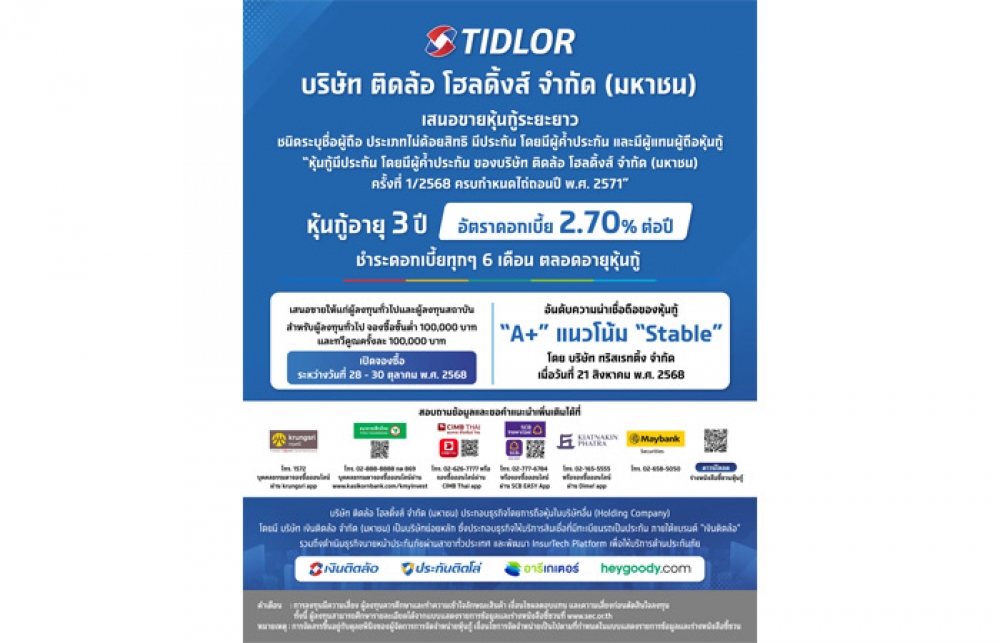 นิวส์ คอนเน็คท์ - คึกคักรับปลายปี! บมจ. ติดล้อ โฮลดิ้งส์ (“TIDLOR”) เปิดขายหุ้นกู้ อายุ 3 ปี อัตราดอกเบี้ย 2.70% ต่อปี จ่ายดอกเบี้ยทุก ๆ 6 เดือนตลอดอายุหุ้นกู้ งานนี้เปิดกว้างให้นักลงทุนทั้งรายใหญ่และรายย่อยร่วมจองซื้อได้ทั่วประเทศ ลงทุนเริ่มต้นเพียง 100,000 บาท และทวีคูณครั้งละ 100,000 บาท เปิดจองซื้อระหว่างวันที่ 28–30 ตุลาคม 2568 (3 วันเท่านั้น!) ผ่านช่องทางจองซื้อสุดสะดวกทั้ง 6 ราย ได้แก่ ธ.กรุงศรีอยุธยา, ธ.กสิกรไทย, ธ.ซีไอเอ็มบี ไทย, ธ.ไทยพาณิชย์, บล.เกียรตินาคินภัทร รวมถึงจองซื้อผ่าน ธ.เกียรตินาคินภัทร และบล.เมย์แบงก์ (ประเทศไทย) บอกเลยว่าดีลนี้น่าจับตา เรตติ้งระดับ “A+” จาก TRIS Rating แถมยังมี บมจ. เงินติดล้อ สุดแกร่งเป็นผู้ค้ำประกัน และมีแบ็กที่แข็งแกร่งจาก ธ.กรุงศรีอยุธยา ความน่าเชื่อถือแน่นแบบนี้… ไม่เตรียมตัวจองซื้อหุ้นกู้ TIDLOR ได้ยังไง