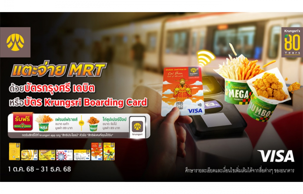 นิวส์ คอนเน็คท์ - ธนาคารกรุงศรีอยุธยา จำกัด (มหาชน)) มอบสิทธิพิเศษสำหรับลูกค้าที่แตะจ่ายรถไฟฟ้า MRT ที่เข้าร่วมรายการ ได้แก่ สายสีแดง สายสีน้ำเงิน สายสีม่วง สายสีชมพู และ สายสีเหลือง ด้วยบัตรกรุงศรี เดบิต หรือบัตร Krungsri Boarding Card ที่มีสัญลักษณ์ Visa Contactless รับฟรี Potato Corner เฟรนช์ฟรายส์ ขนาดเมก้า (เลือกได้ 2 รสชาติ) หรือ ไก่ซุปเปอร์ป๊อป ขนาด จัมโบ้ มูลค่า 89 บาท (จำกัด 1 สิทธิ์/เดือน) กดรับสิทธิ์ได้ที่ krungsri app เมนู “สิทธิประโยชน์” หัวข้อ “สิทธิพิเศษที่คุณได้รับ” ตั้งแต่วันที่ 1 ตุลาคม 2568 – 31 ธันวาคม 2568 ผู้สนใจสามารถดูรายละเอียดและเงื่อนไขเพิ่มเติมได้ที่ เพิ่มเติมได้ที่