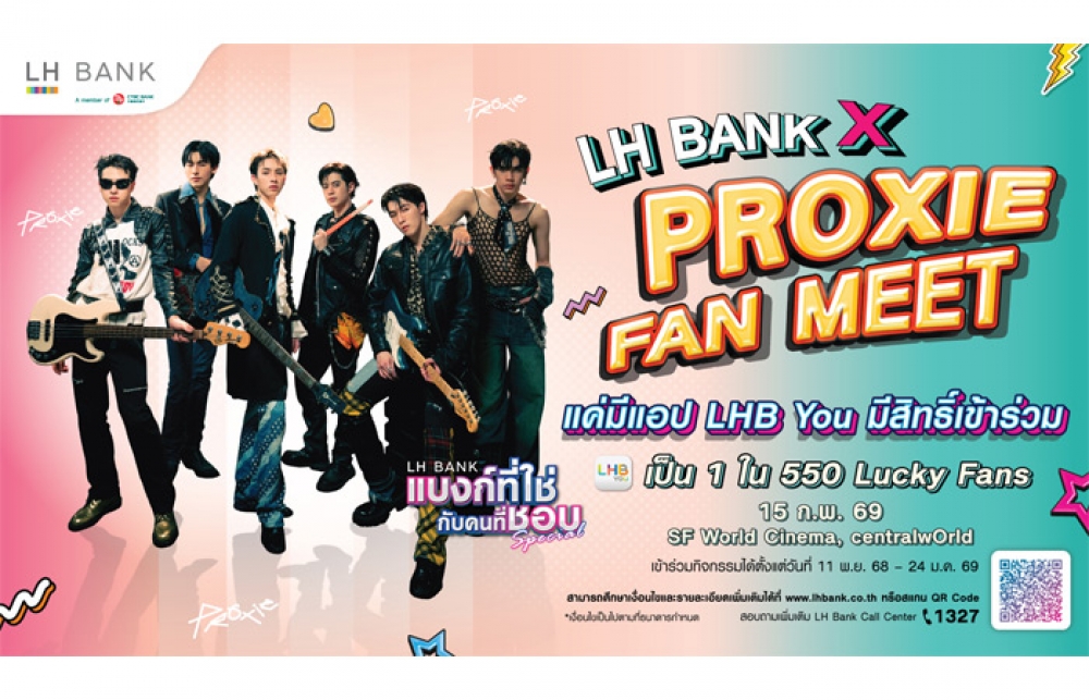 นิวส์ คอนเน็คท์ - ธนาคารแลนด์ แอนด์ เฮ้าส์ จำกัด (มหาชน) หรือ LH Bank เดินหน้าตอกย้ำการเป็น “ไลฟ์สไตล์แบงก์กิ้ง” ต่อยอดความสำเร็จแคมเปญ “LH Bank แบงก์ที่ใช่กับคนที่ชอบสเปเชียล” จัดกิจกรรม “LH BANK X PROXIE FAN MEET” เพื่อมอบประสบการณ์สุดประทับใจและแทนคำขอบคุณให้กับลูกค้าคนสำคัญเนื่องในโอกาสครบรอบ 20 ปีธนาคาร โดยกิจกรรมนี้ LH Bank มอบสิทธิพิเศษสำหรับลูกค้าที่ใช้แอปพลิเคชัน LHB You สามารถลงทะเบียนเพื่อรับสิทธิ์เป็น 1 ใน 550 Lucky Fans ร่วมกิจกรรมแฟนมีตติ้งอย่างใกล้ชิดกับบอยแบนด์สุดฮอตแห่งปีอย่าง PROXIE ในวันที่ 15 กุมภาพันธ์ 2569 ณ โรงภาพยนตร์ SF centralwOrld