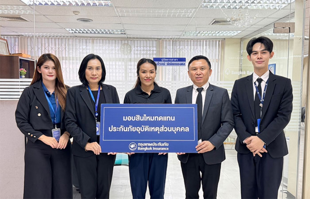 บริษัท กรุงเทพประกันภัย จำกัด (มหาชน) โดยนางสาวปาริชาต อนุชิตชาตรี (ที่ 2 จากซ้าย) ผู้จัดการสาขาอุดรธานี เป็นผู้แทนบริษัทฯ มอบสินไหมทดแทนประกันภัยอุบัติเหตุส่วนบุคคล PA VIP ให้แก่ นางสาวสุวรัตน์ จันยอย (กลาง) ซึ่งเป็นภรรยาของผู้เอาประกันภัยและผู้รับประโยชน์ เป็นจำนวนเงิน 3,120,000 บาท จากกรณีนายเบวิน เลาเรนน์ ไรท์ ผู้เอาประกันภัยเสียชีวิตจากอุบัติเหตุ โดยมีนายรุ่งโรจน์ พิพัฒนมงคล (ที่ 2 จากขวา) ผู้จัดการธนาคารกรุงเทพ สาขาอุดรธานี ร่วมมอบสินไหมทดแทนและเป็นสักขีพยาน ณ ธนาคารกรุงเทพ สาขาอุดรธานี เมื่อวันที่ 5 พฤศจิกายน 2568