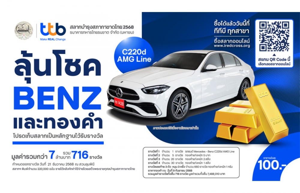 TTB ชวน “ลุ้นรถเบนซ์และทองคำแท่ง” ซื้อสลากกาชาดทีทีบีออนไลน์ ปี 68