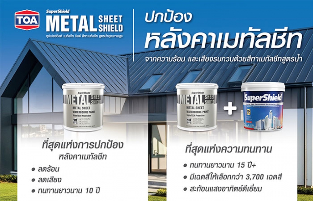 สำหรับนวัตกรรมใหม่ สีทาหลังคาเมทัลชีท ‘ซุปเปอร์ชิลด์ เมทัลชีท ชิลด์’ (SuperShield Metal Sheet Shield) ที่ได้รับการพัฒนาขึ้นด้วยเทคโนโลยี 3X Triple Tech Protection พลังปกป้องเหนือระดับ เพื่อยกระดับมาตรฐานการปกป้องหลังคาโลหะให้ทนทาน เย็นสบาย และเงียบสงบกว่าที่เคย ด้วยคุณสมบัติเด่น 3 ประการ ไม่ว่าจะเป็น 1.Solar Reflection สะท้อนแสงอาทิตย์สูงสุด 96% สะท้อนได้ดีกว่าเมทัลชีทที่ไม่เคลือบสี มากกว่า 2 เท่า และยังสามารถลดอุณหภูมิที่พื้นผิวได้มากกว่าเมทัลชีทที่ไม่ได้เคลือบสีมากถึง 14 องศาเซลเซียส* 2.Noise Reduction ลดเสียงได้มากกว่าถึง 16% เมื่อเทียบกับเมทัลชีทเปลือย และสามารถช่วยลดเสียงได้มากกว่าเมทัลชีทที่บุด้วยพียูโฟมถึงเท่าตัว* 3.High Elongation เนื้อฟิล์มหนา ยืดหยุ่นมากกว่าสีน้ำทั่วไป ช่วยปกป้องและยืดอายุหลังคา