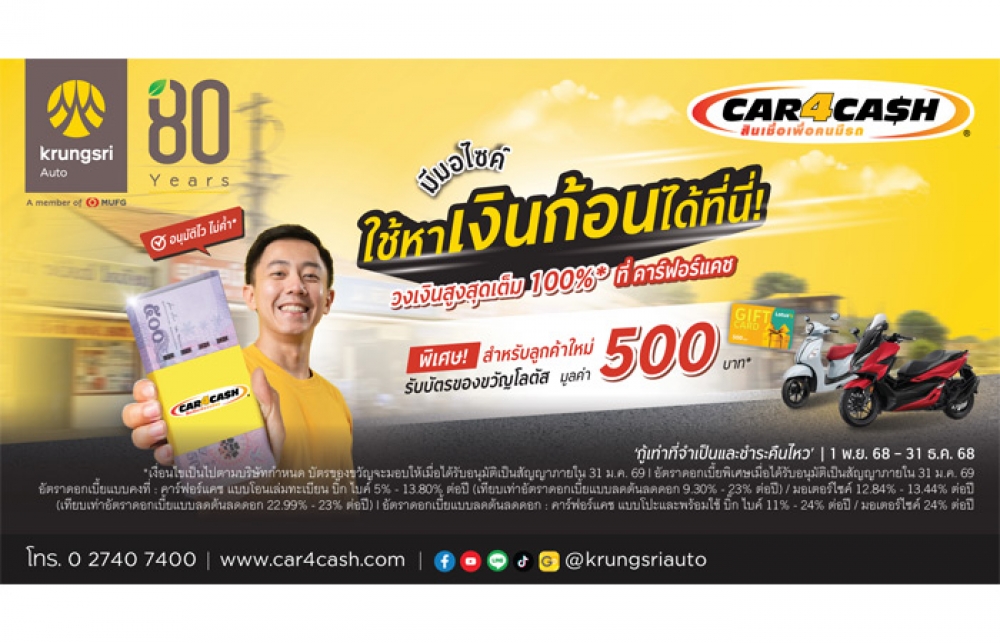นิวส์ คอนเน็คท์ - ‘คาร์ฟอร์แคช’ ผู้นำตลาดสินเชื่อเพื่อคนมีรถ เดินหน้าเสริมสภาพคล่องให้กับคนไทย ท่ามกลางภาวะค่าครองชีพสูงและสภาพเศรษฐกิจชะลอตัว ผ่านแคมเปญ “มีมอไซค์ = มีเงิน ไปต่อได้ ด้วย คาร์ฟอร์แคช” มอบข้อเสนอพิเศษให้เจ้าของบิ๊ก ไบค์และมอเตอร์ไซค์ ใช้รถสร้างเงินก้อนด้วยอัตราดอกเบี้ยเริ่มต้นเพียง 0.42% ต่อเดือนระยะเวลาผ่อนสูงสุด 36 เดือน สำหรับมอเตอร์ไซค์ และ 48 เดือน สำหรับบิ๊ก ไบค์ พร้อมรับบัตรโลตัสมูลค่า 500 บาท เมื่อสมัครสินเชื่อตั้งแต่ 1 พฤศจิกายน – 31 ธันวาคม 2568 และได้รับการอนุมัติเป็นเลขที่สัญญาภายในวันที่ 31 มกราคม 2569