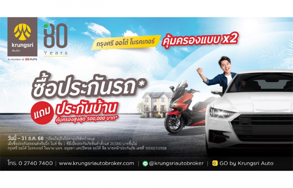 นิวส์ คอนเน็คท์ - ‘กรุงศรี ออโต้ โบรคเกอร์’ นายหน้าประกันภัย ภายใต้บริษัท อยุธยา แคปปิตอล ออโต้ ลีส จำกัด (มหาชน) ในเครือธนาคารกรุงศรีอยุธยา จำกัด (มหาชน) ต้อนรับช่วงเทศกาลส่งท้ายปีเก่าต้อนรับปีใหม่ มอบความคุ้มครองแบบ “คูณสอง” ให้กับลูกค้าคนพิเศษ ผ่านโปรโมชันสุดคุ้ม “ซื้อประกันรถ แถมฟรีประกันบ้าน” มอบความคุ้มครองที่ครอบคลุมโดยไม่ต้องจ่ายเพิ่ม เพียงซื้อประกันภัยรถยนต์ หรือ บิ๊ก ไบค์ ชั้น 1 และชำระเบี้ยประกันภัยขั้นต่ำตั้งแต่ 20,000 บาทขึ้นไป รับฟรี ประกันภัยบ้านคุ้มครองภัยธรรมชาติสูงสุด 500,000 บาท รวมถึงการโจรกรรมตามรายละเอียดความคุ้มครอง ระยะเวลาประกันภัย 6 เดือน สำหรับลูกค้าที่ชำระเงินครบถ้วนเต็มจำนวนครั้งเดียว (ไม่รวมการผ่อนชำระ) เพื่อให้ลูกค้าพักผ่อนได้อย่างสบายใจ หมดห่วงทั้งเรื่องรถและเรื่องบ้านในช่วงเวลาของการเดินทางส่งท้ายปลายปี
