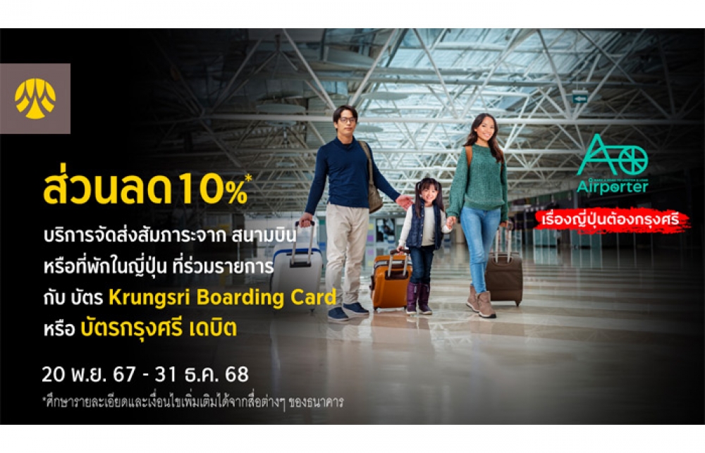 นิวส์ คอนเน็คท์ - ธนาคารกรุงศรีอยุธยา จำกัด (มหาชน) มอบสิทธิพิเศษสำหรับผู้ถือบัตร Krungsri Boarding Card และบัตรกรุงศรี เดบิต ทุกประเภท รับส่วนลด 10% เมื่อใช้บริการจาก Airporter จัดส่งสัมภาระจากสนามบิน โรงแรม หรือห้องพักในญี่ปุ่น ที่ร่วมรายการ โดยจองบริการผ่าน