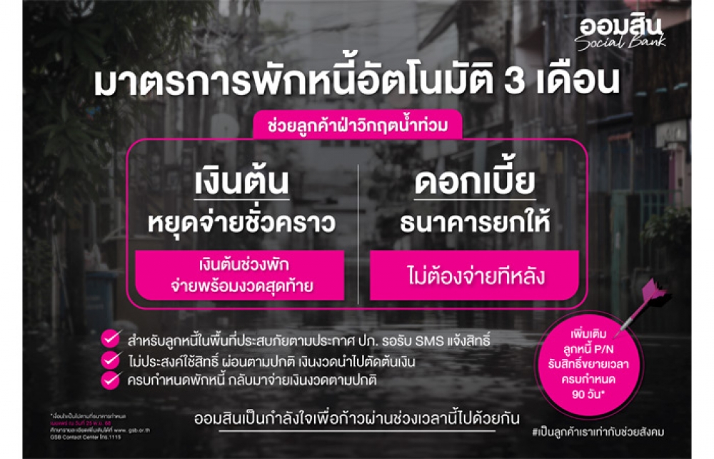 ทั้งนี้ ธนาคารออมสิน ยืนหยัดจุดยืนการเป็นธนาคารเพื่อสังคม ที่พร้อมเคียงข้างให้ความช่วยเหลือลูกค้าประชาชนในการช่วยประคับประคองภาระทางการเงินในช่วงเวลาวิกฤต และขอส่งกำลังใจให้พี่น้องผู้ประสบอุทกภัยทุกคนสามารถกลับมาดำเนินชีวิตได้เป็นปกติในเร็ววัน