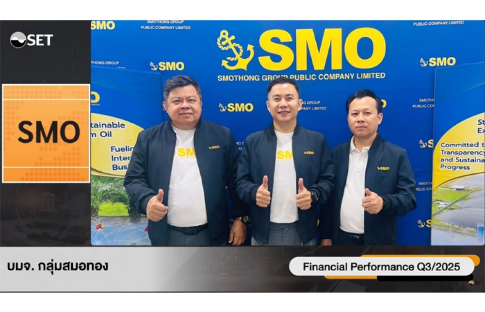 นิวส์ คอนเน็คท์ - นายกิตติพงษ์ พวงมาลา ประธานเจ้าหน้าที่บริหาร นายกุศล ศรีเปารยะ ประธานเจ้าหน้าที่บริหารการเงิน นายศักดา ทองรอง รองกรรมการผู้จัดการอาวุโส สายงานสำนักงาน บริษัท กลุ่มสมอทอง จำกัด (มหาชน) หรือ SMO ร่วมนำเสนอผลการดำเนินงานผลประกอบการประจำไตรมาส 3/2568 และทิศทางการเติบโตของบริษัทในงานบริษัทจดทะเบียนพบผู้ลงทุน (Opportunity Day) จัดโดยตลาดหลักทรัพย์แห่งประเทศไทย โดยผลประกอบการของบริษัทในช่วง 9 เดือน ของปี 2568 บริษัทมีรายได้รวม 7,002.04 ล้านบาท เพิ่มขึ้นจากช่วงเดียวกันของปีก่อนที่มีรายได้ 4,711.58 ล้านบาท หรือคิดเป็นการเติบโต 49.14% และมีกำไรสุทธิ 652.07 ล้านบาท เพิ่มขึ้นจากปีก่อนที่ 305.57 ล้านบาท หรือเติบโตสูงถึง 113.39% YoY ซึ่งรายได้ของบริษัทมาจากธุรกิจหลักคือ ผลิตและจำหน่ายน้ำมันปาล์มดิบและผลิตภัณฑ์ที่เกี่ยวเนื่อง คิดเป็น 98.26% ของรายได้ทั้งหมด และอีก 1.74% มาจากธุรกิจไฟฟ้าชีวภาพ โดยปัจจุบัน SMO มีกำลังการผลิตรวม 240 ตันผลปาล์มสดต่อชั่วโมง และจะเพิ่มขึ้นเป็น 315 ตันต่อชั่วโมงในปี 2569 พร้อมขยายกำลังผลิตไฟฟ้ารวมเป็น 14.38 เมกะวัตต์ และคณะกรรมการบริษัทมีมติอนุมัติจ่าย เงินปันผลระหว่างกาลเป็นเงินสดในอัตรา 0.15 บาทต่อหุ้น จากผลกำไรสะสมส่วนที่ได้รับการส่งเสริมการลงทุน (BOI) โดยกำหนดวัน XD วันที่ 25 พฤศจิกายน 2568 และจ่ายเงินปันผลในวันที่ 11 ธันวาคม 2568 ซึ่งคิดเป็น Dividend Yield 3.81%