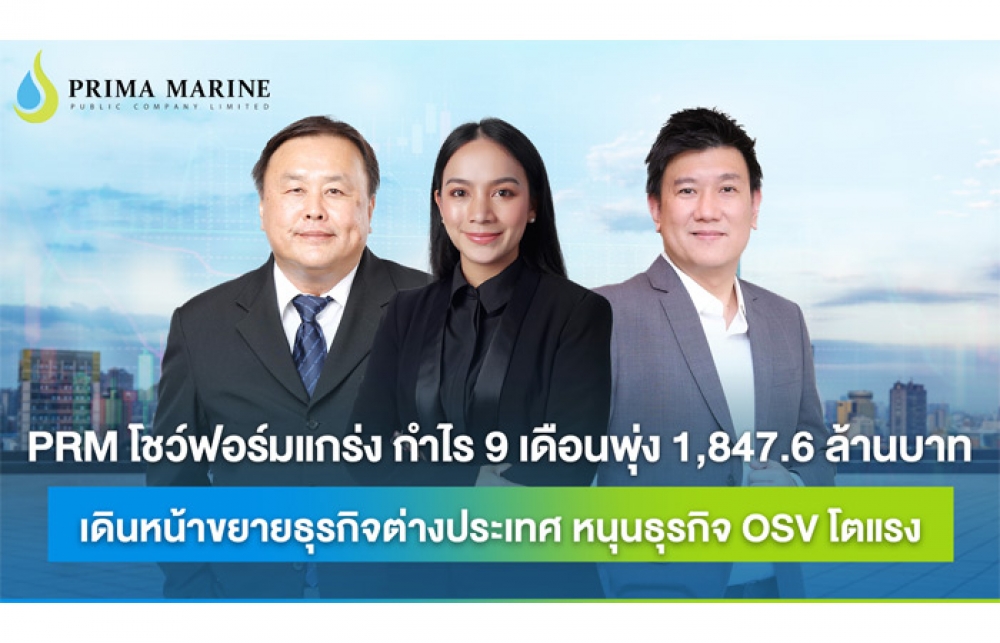 นิวส์ คอนเน็คท์ - นางสาวสุธาสินี หมื่นละม้าย รองประธานเจ้าหน้าที่บริหารสายงานการลงทุน นายวิริทธิ์พล จุไรสินธุ์ ผู้อำนวยการสายงานการเงินและบัญชี พร้อมด้วย นายพชร รอดสมบูรณ์ ผู้จัดการอาวุโสฝ่ายการเงินและนักลงทุนสัมพันธ์ บริษัท พริมา มารีน จำกัด (มหาชน) หรือ PRM ร่วมแถลงข้อมูลบริษัทแก่นักวิเคราะห์หลักทรัพย์ ในงาน Analyst Meeting ประจำไตรมาส 3/2568 ผ่านสื่ออิเล็กทรอนิกส์ ณ บริษัท พริมา มารีน จำกัด (มหาชน)