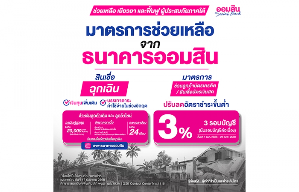 เมื่อวันที่ 17 ธันวาคม 2568 นางลภาวรรณ จันทร์กระจ่าง รองผู้อำนวยการธนาคารออมสิน รักษาการแทนผู้อำนวยการธนาคารออมสิน เปิดเผยว่า ตามมติคณะรัฐมนตรีเมื่อวันที่ 2 ธันวาคม 2568 เห็นชอบให้กระทรวงการคลังและสถาบันการเงินเฉพาะกิจเร่งออกมาตรการช่วยเหลือ เยียวยา ฟื้นฟูประชาชนที่ได้รับความเดือดร้อนจากอุทกภัยในพื้นที่ภาคใต้ตามประกาศของกรมป้องกันและบรรเทาสาธารณภัย (ปภ.) ธนาคารออมสินได้ออกชุดมาตรการทางการเงินที่ครอบคลุมกลุ่มลูกค้าเดิมและลูกค้าใหม่