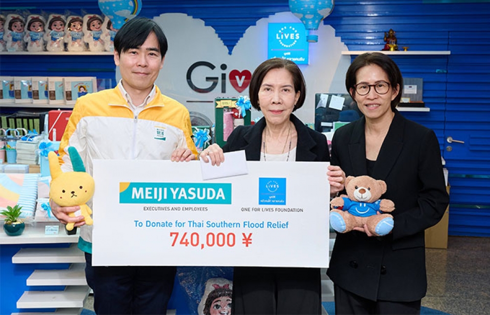 คณะผู้บริหารและพนักงาน บริษัท เมจิ ยาสุดะ ไลฟ์อินชัวรันส์ ร่วมสมทบทุนช่วยเหลือ ผู้ประสบอุทกภัยภาคใต้ ผ่าน มูลนิธิหนึ่งคนให้ หลายคนรับ จำนวน 740,000 เยน (ประมาณ 146,000 บาท)