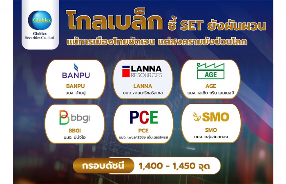 เมื่อวันที่ 23 มีนาคม 2569 นางสาววิลาสินี บุญมาสูงทรง ผู้ช่วยกรรมการผู้จัดการ บริษัทหลักทรัพย์ โกลเบล็ก จำกัด (GBS) เปิดเผยว่า ทิศทางดัชนี SET มีโอกาสแกว่งตัวผันผวนในกรอบ 1,400-1,450 จุด แม้ภาพรวมจะได้รับแรงหนุนเชิงบวกจากความชัดเจนทางการเมืองภายในประเทศ ภายหลังจากที่ประชุมสภาผู้แทนราษฎรมีมติเสียงข้างมาก 293 เสียงเลือกนายอนุทินเป็นนายกรัฐมนตรี ซึ่งถือเป็นกุญแจสำคัญในการปลดล็อกสูญญากาศทางการบริหาร และกำลังเข้าสู่กระบวนการจัดตั้งคณะรัฐมนตรีชุดใหม่ที่คาดว่าจะมีความชัดเจนในช่วงสิ้นเดือนมีนาคมนี้ เพื่อเตรียมแถลงนโยบายต่อรัฐสภาให้เสร็จสิ้นก่อนเทศกาลสงกรานต์ อย่างไรก็ตาม ตลาดยังคงมีความกังวลแฝงอยู่จากประเด็นที่ศาลรัฐธรรมนูญรับคำร้องวินิจฉัยกรณีรูปแบบบัตรเลือกตั้งซึ่งอาจต้องใช้เวลาติดตามความชัดเจนอีกราวหนึ่งเดือน