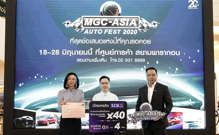 ธนาคารไทยพาณิชย์ จับมือ กลุ่มบริษัท มาสเตอร์ กรุ๊ป คอร์ปอเรชั่น (เอเชีย) จำกัด หรือ เอ็มจีซี–เอเชีย พร้อมด้วย ศูนย์การค้าสยามพารากอน มอบสิทธิพิเศษสุดเอ็กซ์คลูซีฟ ให้กับลูกค้าผู้ถือบัตรเครดิตไทยพาณิชย์ เมื่อชำระเต็มจำนวนและจองรถยนต์ใหม่ภายในงาน เพียงชำระเงินผ่านบัตรเครดิตไทยพาณิชย์ รับคะแนนสะสม SCB Rewards / SCB M Point รวมสูงสุด X 40 เท่า นอกจากนี้สำหรับลูกค้าที่แบ่งจ่าย สามารถแบ่งจ่ายเงินดาวน์ 0% นาน 4 เดือน เมื่อมียอดชำระค่าเงินดาวน์ขั้นต่ำ 50,000 บาทขึ้นไป/เซลล์สลิป และสูงสุด 500,000 บาท/เซลล์สลิป ภายในงาน MGC-ASIA Auto Fest 2020 ซึ่งจัดขึ้นระหว่างวันที่ 18-28 มิถุนายน 2563 ณ ศูนย์การค้าสยามพารากอน โดยมี ดร.สัณหวุฒิ ธรรมชวนวิริยะ (ขวา) ประธานเจ้าหน้าที่บริหาร กลุ่มบริษัท มาสเตอร์ กรุ๊ป คอร์ปอเรชั่น (เอเชีย) จำกัด พร้อมด้วย นางสาวกัญฒ์ภิอร สุวรรณ (กลาง) ผู้อำนวยการอาวุโส ผลิตภัณฑ์บัตรเครดิต ธนาคารไทยพาณิชย์ และ นางมยุรี ชัยพรหมประสิทธิ์ (ซ้าย) รองกรรมการผู้จัดการใหญ่อาวุโส สายงานการตลาด บริษัท สยามพารากอน ดีเวลลอปเม้นท์ จำกัด ร่วมเปิดตัวแคมเปญ เมื่อเร็วๆ นี้