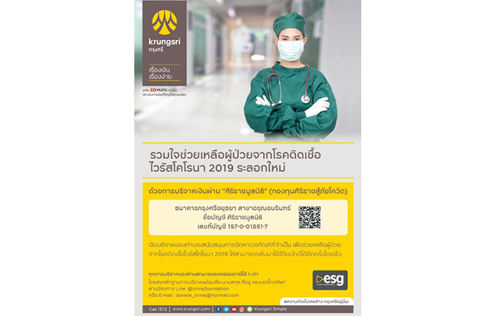 ธนาคารกรุงศรีอยุธยา จำกัด (มหาชน) ขอเชิญร่วมใจช่วยเหลือผู้ป่วยจากโรคติดเชื้อไวรัสโคโรนา 2019 ระลอกใหม่ ด้วยการบริจาคเงินผ่าน “ศิริราชมูลนิธิ” (กองทุนศิริราชสู้ภัยโควิด) บัญชีธนาคารกรุงศรีอยุธยา สาขาอรุณอัมรินทร์ ชื่อบัญชี ศิริราชมูลนิธิ เลขที่บัญชี 157-0-01851-7 เงินบริจาคของท่านจะสนับสนุนการจัดหาเวชภัณฑ์ที่จำเป็น เพื่อช่วยเหลือผู้ป่วยจากโรคติดเชื้อไวรัส โคโรนา 2019 ให้สามารถกลับมาใช้ชีวิตปกติได้อีกครั้งโดยเร็ว ทุกการบริจาคของท่านสามารถนำไปลดหย่อนภาษีได้ 1 เท่า โดยส่งหลักฐานการบริจาคพร้อมชื่อ-นามสกุล ที่อยู่และหมายเลขโทรศัพท์ ผ่านช่องทาง Line : @sirirajfoundation หรือ E-mail : donate_siriraj@hotmail.com ติดต่อสอบถามเพิ่มเติมได้ที่ : ศิริราชมูลนิธิ โทร. 0-2414-1414, 0-2419-7688