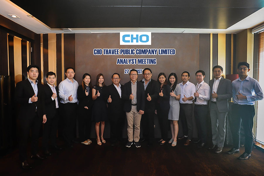 คุณสุรเดช ทวีแสงสกุลไทย (กลาง) กรรมการผู้จัดการใหญ่และประธานเจ้าหน้าที่บริหาร พร้อมด้วยคุณณรงค์ องอาจมณีรัตน์ (ที่ 7 จากขวา) รองกรรมการผู้จัดการใหญ่ และคุณนิติธร ดีอำไพ (ที่ 6 จากซ้าย) รองประธานเจ้าหน้าที่บริหาร-การเงิน บริษัท ช ทวี จำกัด (มหาชน) หรือ CHO ถ่ายภาพร่วมกับนักวิเคราะห์หลักทรัพย์ในงาน Analyst Meeting โดยเปิดเผยว่าผลการดำเนินงานในช่วงครึ่งแรกของปีของบริษัท เริ่มกลับเข้าสู่โหมดปกติ เน้นปรับสัดส่วนฐานะทางการเงินให้ดีที่สุด พร้อมเดินหน้าประมูลงานใหม่ ดันแบ็คล็อกเพิ่มขึ้นเป็น 1,828 ล้านบาท และเตรียมขยายศูนย์ซ่อมบำรุง “สิบล้อ 24 ชม.” อีก 2 แห่งในปี 2562