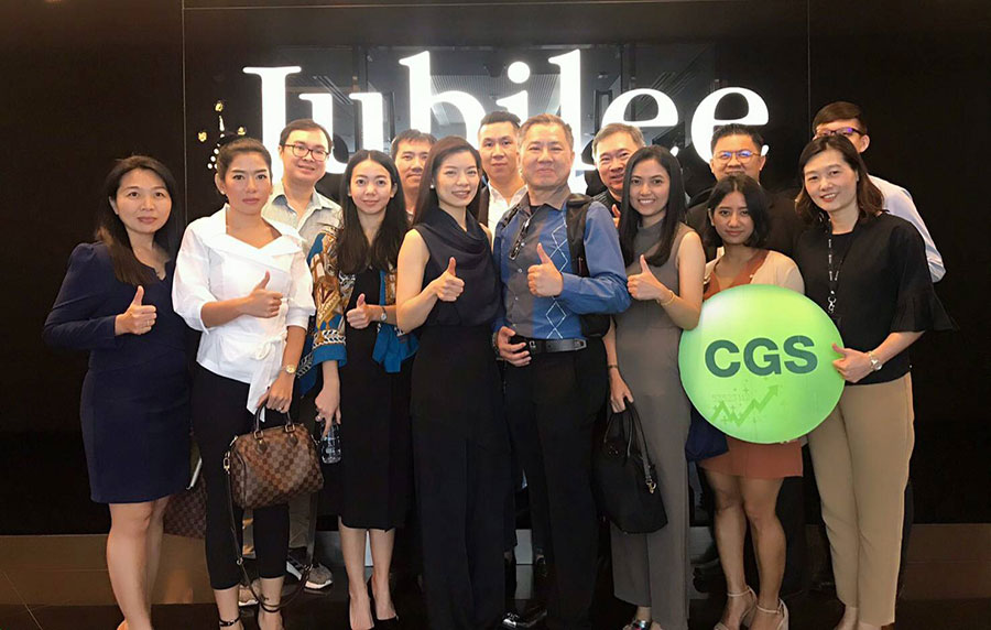 บริษัทหลักทรัพย์คันทรี่ กรุ๊ป จำกัด (มหาชน) (CGS) นำทีมโดย คุณปรีชาวุฒิ ขุมทรัพย์ (ที่ 4 จากขวา) กรรมการผู้จัดการสายตราสารทุน 2 พาผู้จัดการกองทุน และนักลงทุน High Net worth เข้ารับฟังข้อมูลของบริษัท ยูบิลลี่ เอ็นเตอร์ไพรส์ จำกัด (มหาชน) หรือ JUBILE ซึ่งเป็นบริษัทค้าปลีกเพชรที่มีส่วนแบ่งตลาดอันดับหนึ่ง เคาน์เตอร์เพชรของประเทศไทย โดยในช่วงครึ่งหลังของปีนี้ JUBILE ได้ปรับเปลี่ยนกลยุทธ์การเติบโตจากเน้นขยายสาขา สู่เน้นการเพิ่มยอดขายต่อสาขา และเตรียมออกผลิตภัณฑ์ใหม่ที่เป็น Exclusive เพื่อขยายฐานลูกค้ากลุ่มใหม่ โดยมีคุณอัญรัตน์ พรประกฤต (ที่ 4 จากซ้าย) ประธานเจ้าหน้าที่บริหาร ให้การต้อนรับ ที่สำนักงานบริษัท เมื่อเร็ว ๆ นี้