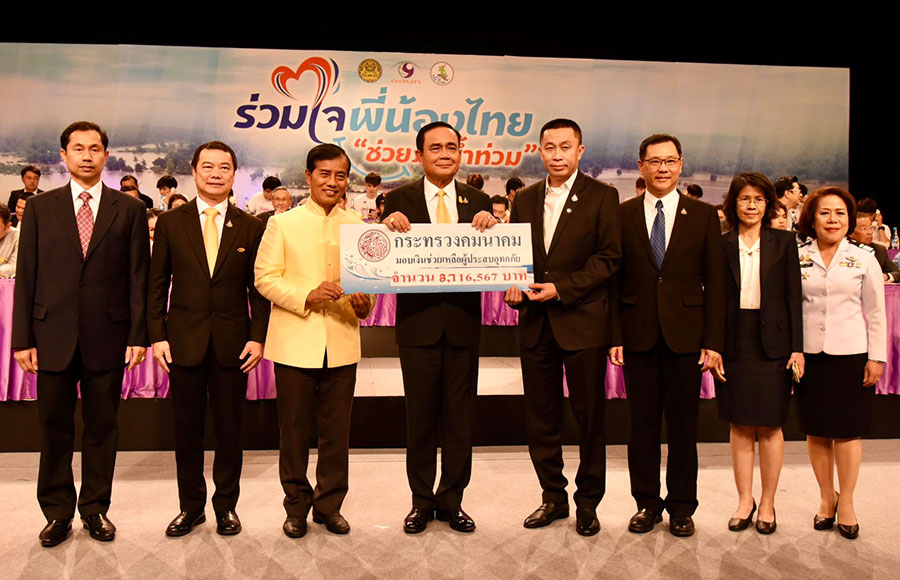 พลเอก ประยุทธ์ จันทร์โอชา นายกรัฐมนตรี รับมอบเงินบริจาคในนามกระทรวงคมนาคมจากนายศักดิ์สยาม ชิดชอบ รัฐมนตรีว่าการกระทรวงคมนาคม และผู้บริหารหน่วยงานในสังกัดกระทรวงคมนาคม สมทบเข้ากองทุนเงินช่วยเหลือผู้ประสบสาธารณภัย สำนักนายกรัฐมนตรีในโครงการ “ร่วมใจ พี่น้องไทย ช่วยภัยน้ำท่วม” เพื่อช่วยเหลือและฟื้นฟูชีวิตความเป็นอยู่ของประชาชนที่ได้รับความเดือดร้อนจากสถานการณ์อุทกภัยทางภาคเหนือและภาคตะวันออกเฉียงเหนือ โดยบริษัท ท่าอากาศยานไทย จำกัด (มหาชน) ร่วมบริจาคเงิน จำนวน 1,000,000 บาท สนับสนุนโครงการดังกล่าว เมื่อวันที่ 17 กันยายน 2562 ณ ห้องส่ง 5 อาคารปฏิบัติการบริษัท อสมท.จำกัด (มหาชน)