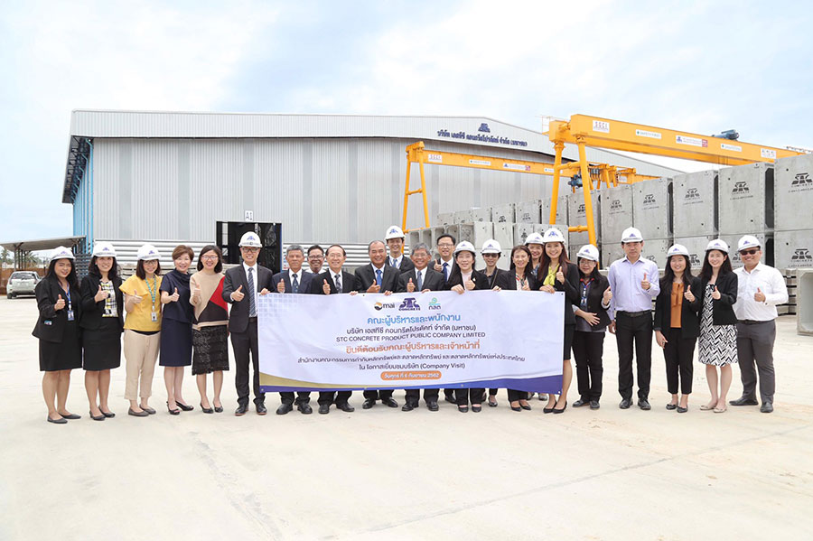 นายณรงค์ฤทธิ์ ถาวรวิศิษฐพร (ที่ 9 จากขวา) ประธานกรรมการ นายสุรสิทธิ์ ชัยตระกูลทอง (ที่ 9 จากซ้าย) รองประธานกรรมการ และ นายเอกชัย ชัยตระกูลทอง (ที่ 6 จากซ้าย) กรรมการผู้จัดการ บริษัท เอสทีซี คอนกรีตโปรดัคท์ จำกัด (มหาชน) (STC) ผู้ผลิตและจำหน่ายผลิตภัณฑ์คอนกรีตทุกประเภท ภายใต้เครื่องหมายการค้า “STC” พร้อมด้วยคณะกรรมการ ผู้บริหารบริษัทฯ ให้การต้อนรับผู้บริหารและเจ้าหน้าที่จากสำนักงานคณะกรรมการกำกับหลักทรัพย์และตลาดหลักทรัพย์ (สำนักงาน ก.ล.ต.) และตลาดหลักทรัพย์แห่งประเทศไทย (ตลท.) ในโอกาสเข้าเยี่ยมชมกิจการ เพื่อเตรียมความพร้อมเข้าจดทะเบียนในตลาดหลักทรัพย์ เอ็ม.เอ.ไอ (mai) โดยมีบริษัทหลักทรัพย์ เคทีบี (ประเทศไทย) จำกัด (มหาชน) (KTBST) ในฐานะที่ปรึกษาทางการเงิน และผู้จัดการการจัดจำหน่ายและรับประกันการจำหน่ายหุ้นสามัญเพิ่มทุน ร่วมให้ข้อมูล และถ่ายภาพร่วมกันเป็นที่ระลึก ณ โรงงานบริษัท อ.บางละมุง จ.ชลบุรี เมื่อเร็วๆ นี้