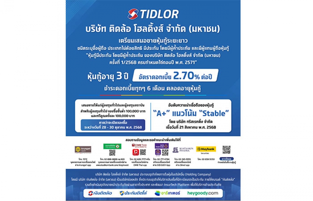 TIDLOR เคาะดอกเบี้ยหุ้นกู้อายุ 3 ปี ที่อัตรา 2.70%